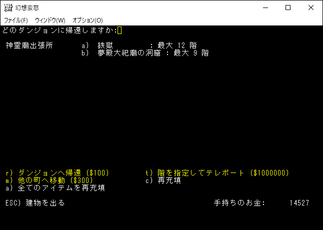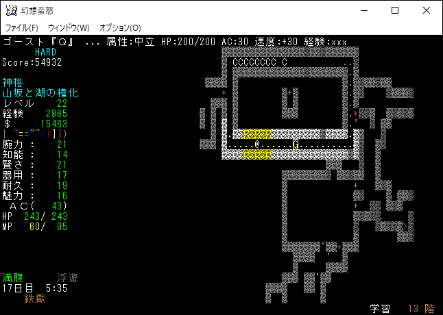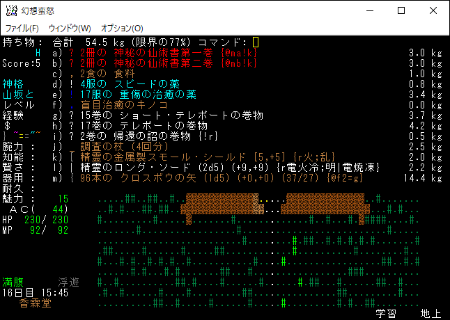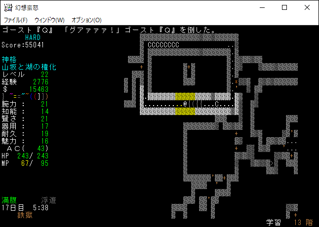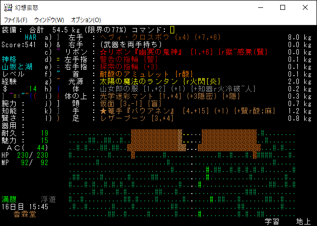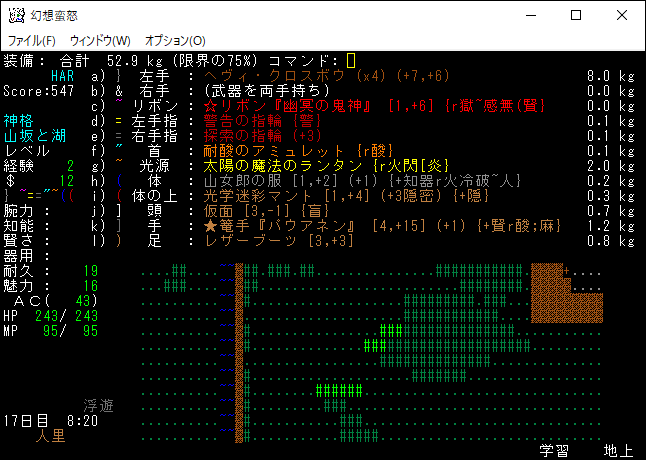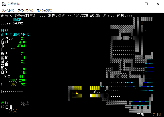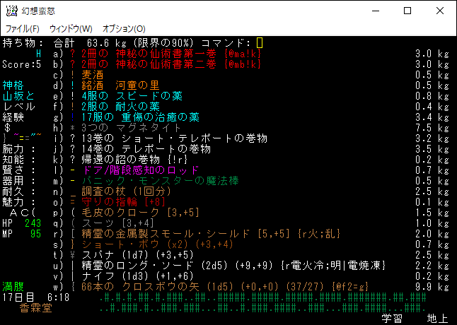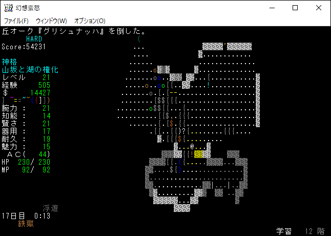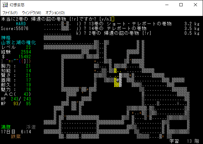 地下13階の探索が終わりました。今日は幻想蛮怒をプレイしまくったので疲れた。地下14階には降りずに人里に帰還します。変愚蛮怒(幻想蛮怒)は疲れているとき、あるいは眠いときにプレイすると100%死ぬ。