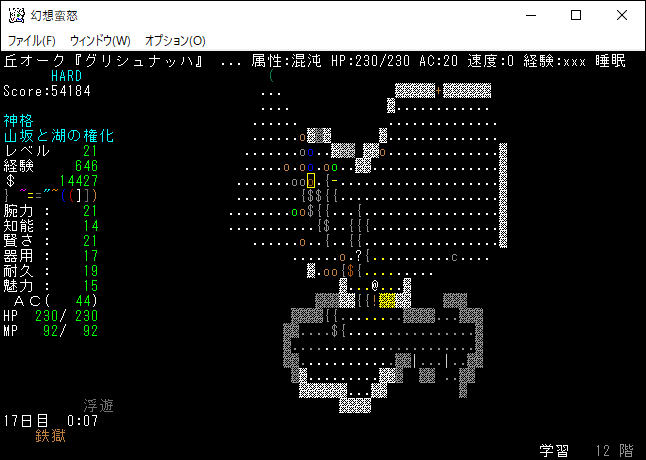 それでは鉄獄の地下12階に帰還してレベル上げをします。最近はユニークモンスターを倒しても信仰ポイントが増えないため悲しい。もっと階段を降りまくって強い敵と戦いたいですね。