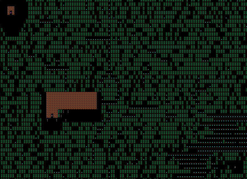 以上で現状の確認は終わり。それでは霧雨魔法店を初訪問しましょう。画面の中央にある@が香霖堂にいる加奈子だ。霧雨魔法店は香霖堂の右側にある森林に囲まれた*です。