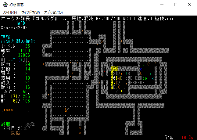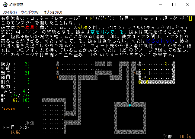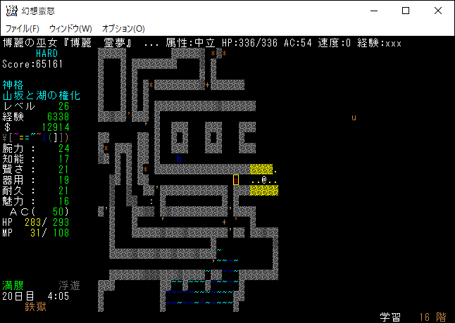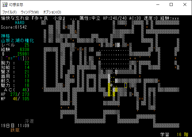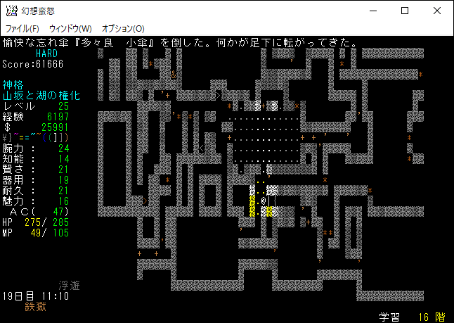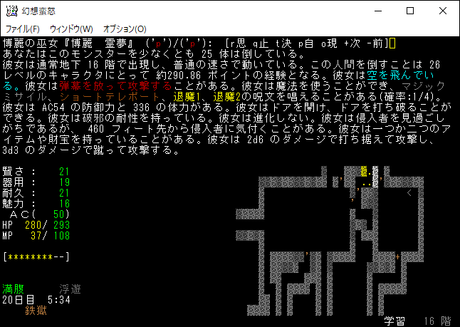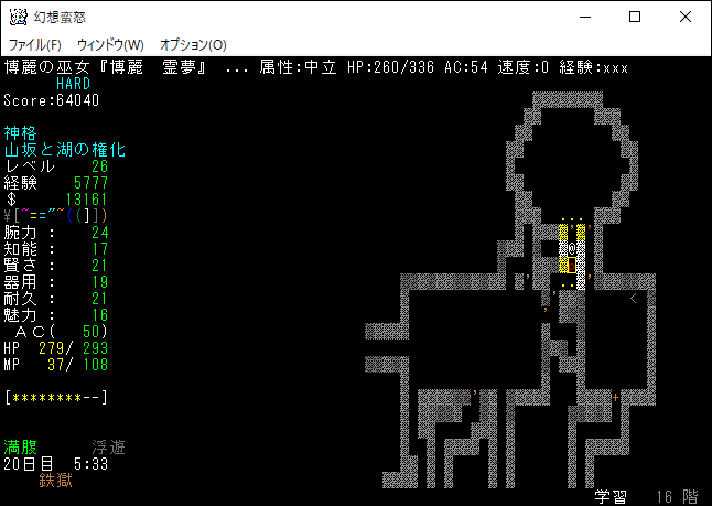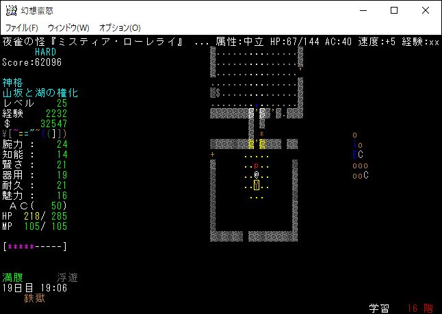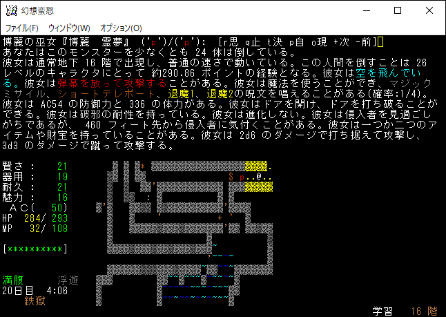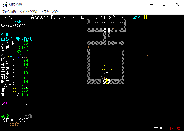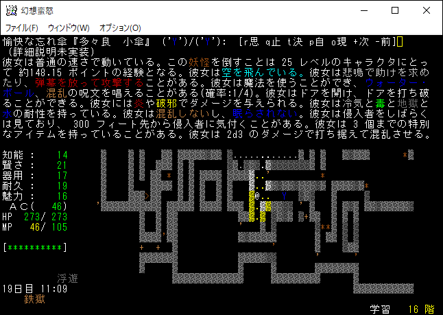 地下16階に帰還したところ階層の雰囲気が最悪でした。もしかしたらアーティファクト級のアイテムが落ちているのかもしれない。ウキウキしながら歩いていたら夜雀の怪『ミスティア・ローレライ』と遭遇したよ。ミスティアは盲目攻撃をしてくるようですね。たぶん盲目耐性が無かったら敗北していた。