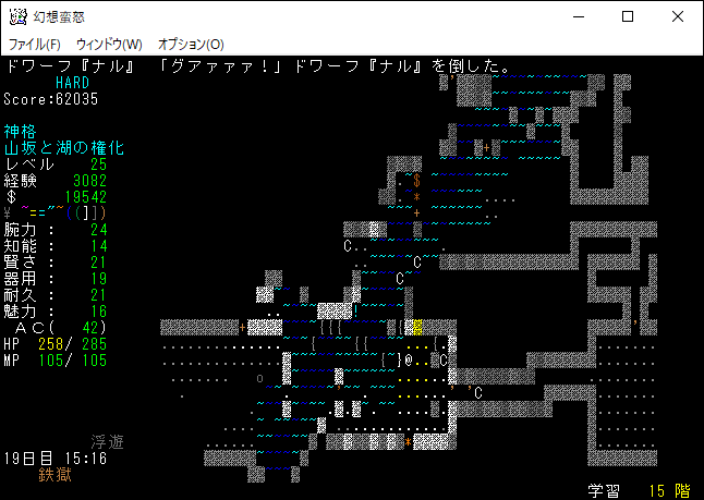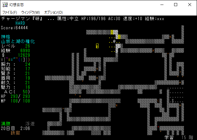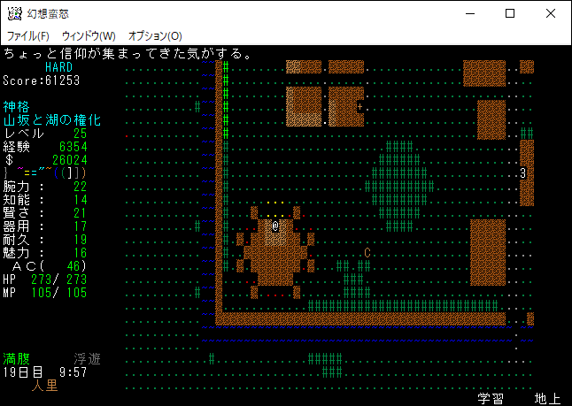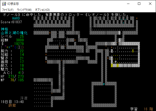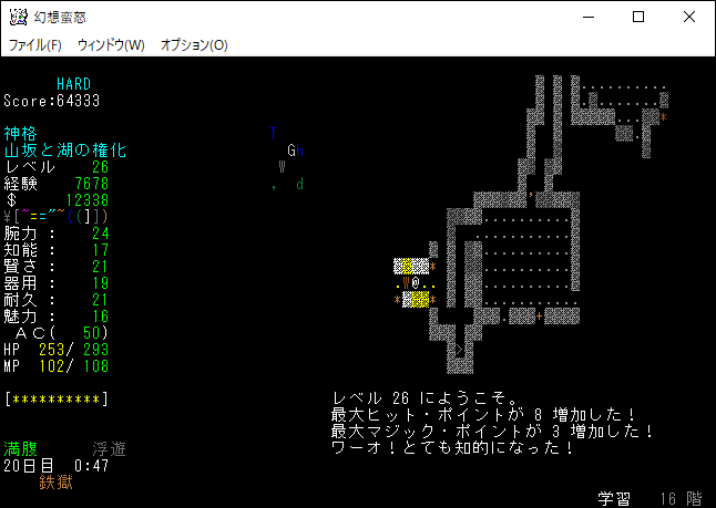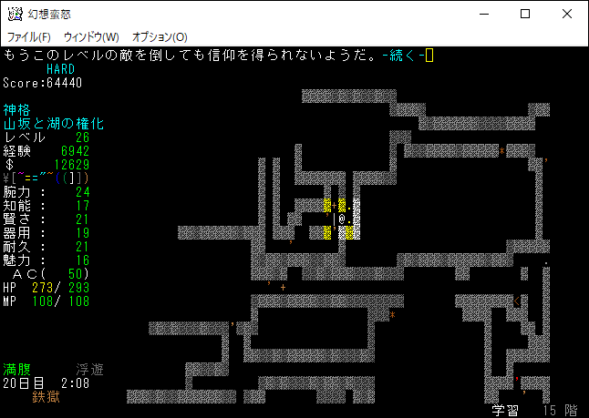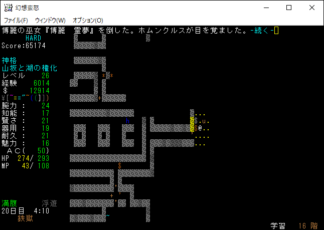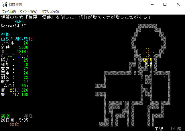 先ほどと同じく龍神エゴの鉄球でぶん殴り霊夢を撃破しました。それは良いのだけど「信仰が増えて力が増した気がする!」とログが表示されている!霊夢から稼いだポイントで信仰度が2になったってことだよな。俺はwikiを誤読していたようだ。霊夢と魔理沙からも普通にポイントを得られたのか。信仰度2のボーナスは「全能力のプラス値が2になった」、「HPのプラス値がレベル×2になった」、「解除、魔道具、魔法防御、探索、隠密の技能にプラス」、「特技が強くなった」です。