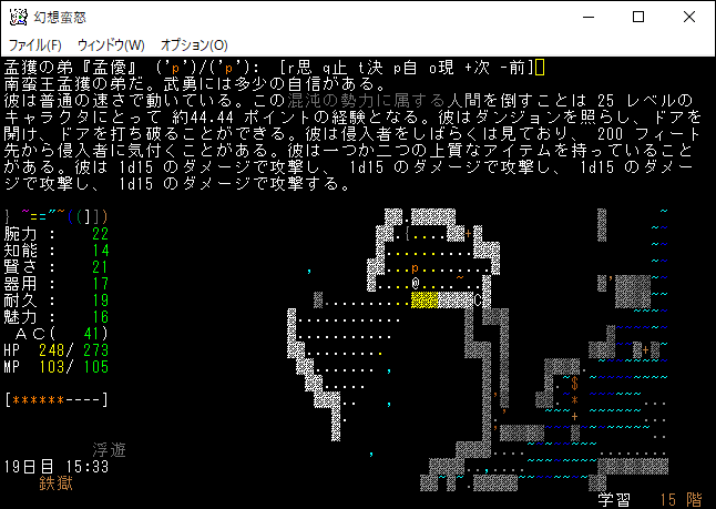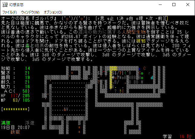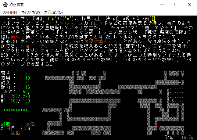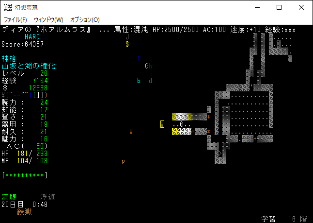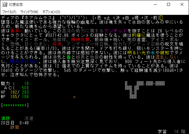 HP2500のくそヤバイユニークが現われやがった。ディアの『ホアルムラス』は強力な攻撃魔法や召喚魔法を使うユニークモンスターだ。うかつに調査の杖を使ったが、ワンターンキルをされてもおかしくなかった。たまにこういう影のジャックみたいな即死級のユニークが出現するんだよな。さっさと逃げて別の階層に移動しましょう。