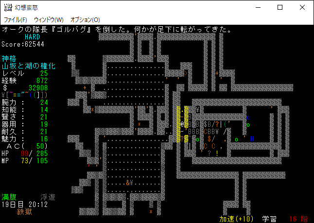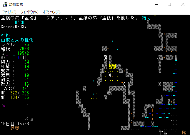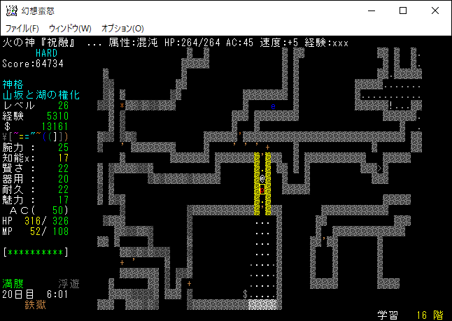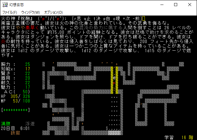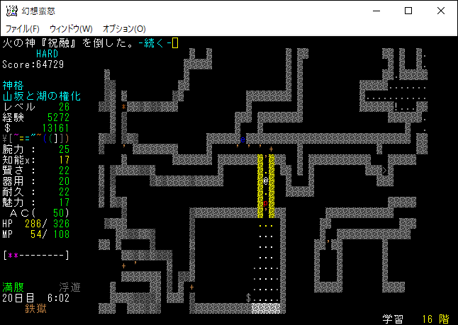 何度か巻物を燃やされたけど火の神『祝融』を撃破しました。今日は長時間ゲームをプレイしたので疲労困憊だ。人里に戻ってアイテムを整理したら投稿を終わりにします。