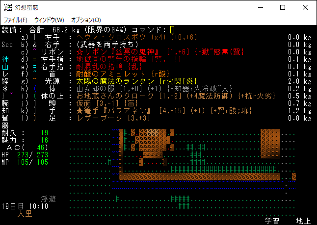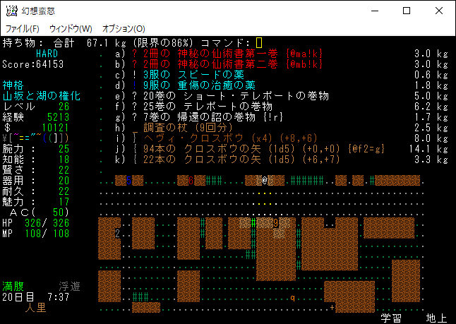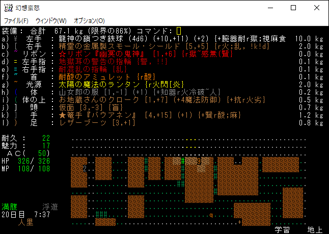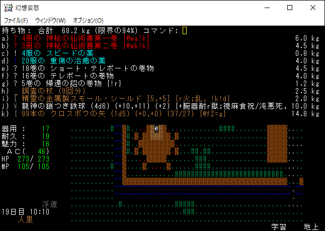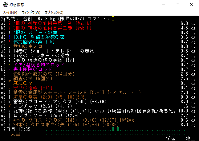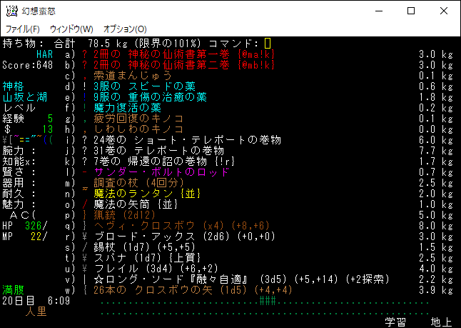 現在の所持品は上の画像。ダンジョンに帰還したら階層の雰囲気がわかるまで適当に戦います。階層の雰囲気が悪かったら全モンスター感知を使ってユニークを倒す。階層の雰囲気が普通だったら地形感知とテレポートの魔法を使って別のフロアに移動しよう。