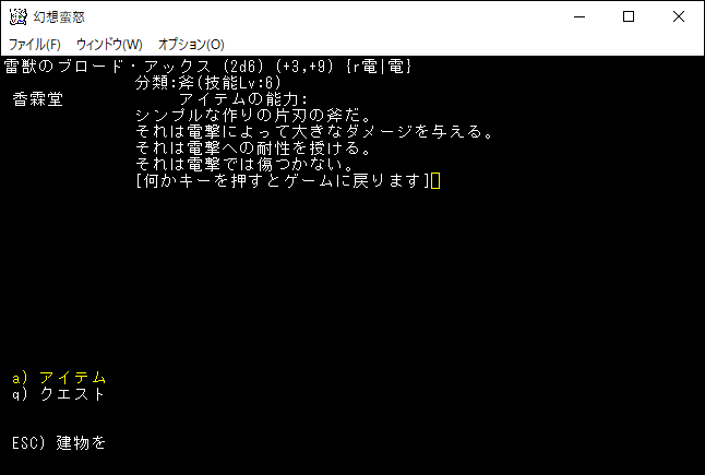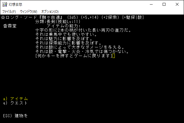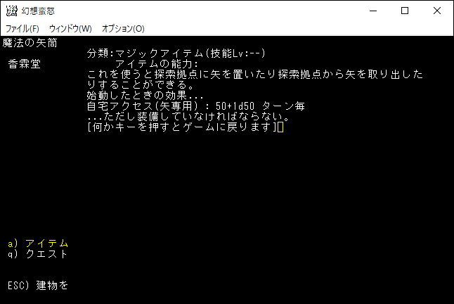 魔法の矢筒の*鑑定*結果は上の画像。発動すると我が家から矢を取り出したり、預けたりできるらしい。なんという便利なアイテムだ。弓をメインにしているクラスなら魔法の矢筒は必須でしょう。これは本家には無い幻想蛮怒だけのアイテムなのかね。俺がプレイしていた頃の変愚蛮怒は折れた武器の修復システムが無かったし、★エリリルなんてアーティファクトも存在しなかった。幻想蛮怒だけのシステムなのか、本家と共有しているシステムなのか、よくわからないものが多々ある。