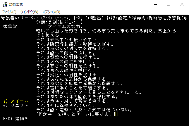 守護者のサーベルの*鑑定*結果は上の画像。本家変愚蛮怒の防衛者エゴと同じような性能をしている。メイジ系のクラスなら大活躍するエゴですな。武器枠で隠密がプラスになるのは素晴らしすぎるぜ。このツモで下水道クエストとミミッククエストを突破できるようになりました。
