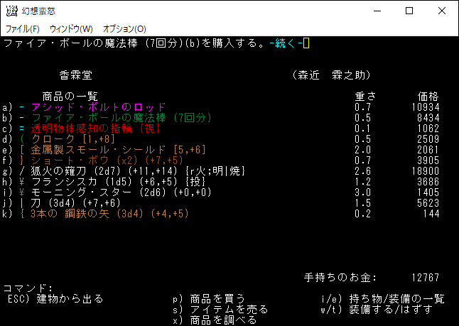 人里に帰還したときの所持品は上の画像。☆ロングソードはチャージマン『研』からゲットしました。「魔法の矢筒」という初めて見かけるアイテムがあります。魔法のランタンはクローン地獄などで使い捨てするのに役立つ。魔力復活の薬は重要アイテムだ。それなりに優秀な戦利品を入手できたな。