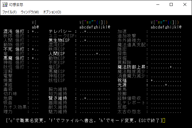 現在の耐性は上の画像。モンスターのHPが高くなったせいか、あっという間に矢が尽きるため、嫌でも近接攻撃をメインにしなければならない。近接攻撃をメインにするなら恐怖耐性を埋めないとダメだよな。隠密の向上と恐怖耐性の取得を兼ねた耐性パズルは可能だけど近接攻撃力が下がってしまう。