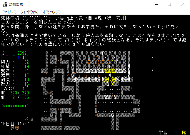 ユニークモンスターではないけど「死体の塊」と遭遇しました。こいつはターンの経過と共に増殖するモンスターです。メイジならマジックミサイルを撃ちまくって経験値を稼ぐことができます。近接攻撃しかできない戦士系のクラスは交戦を避けた方が良い。こいつの攻撃をくらいまくると耐久の最大値が減ってしまう。