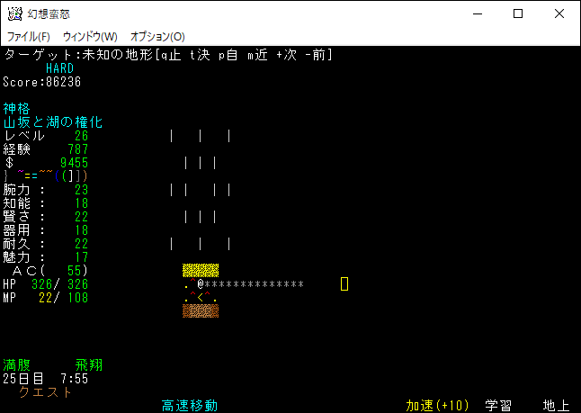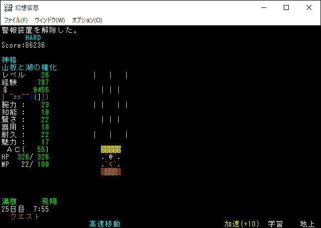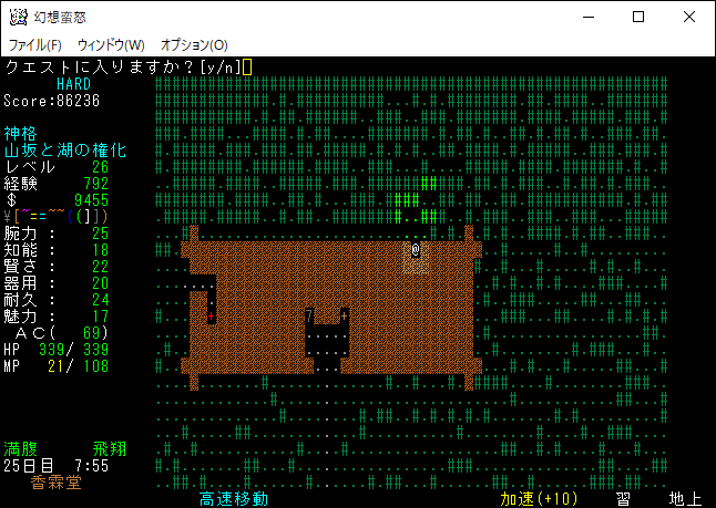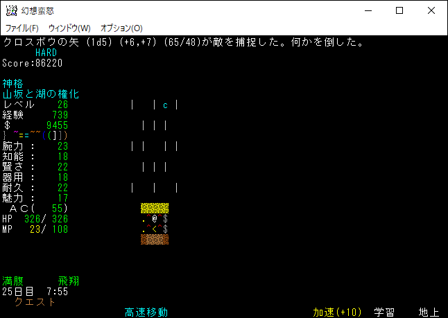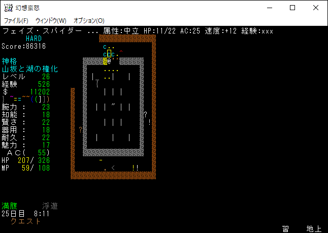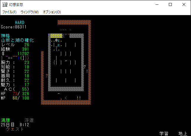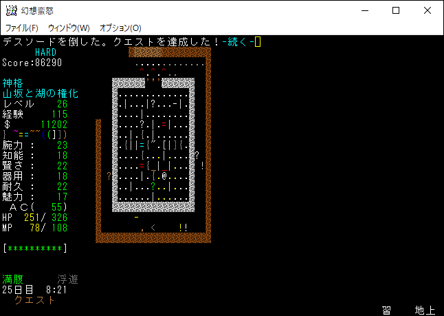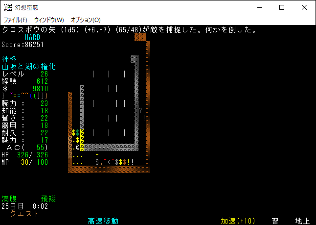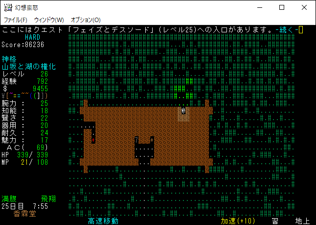 幻想蛮怒のプレイ日記を始めます。難易度HARDの八坂加奈子をプレイ中です。前回は「ミミックの財宝」クエストを達成しました。今回の投稿は「フェイズとデスソード」クエストに挑戦します。最近は価値のある武具を拾えていません。そろそろ超級アーティファクトをゲットできる気がするんだよ。約束された勝利の剣と呼ばれている「★リンギル」を入手できる予感がします!