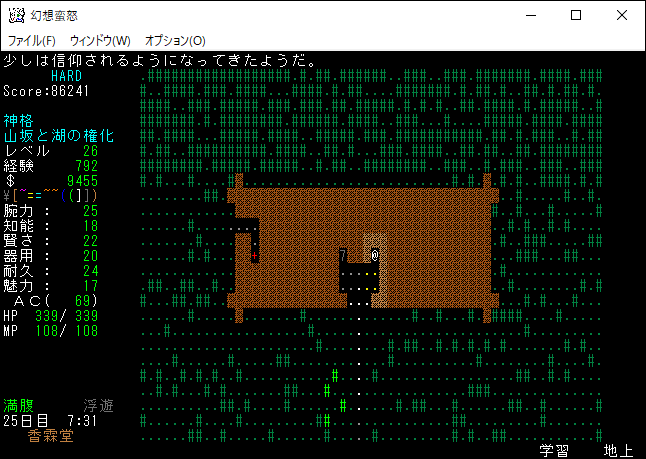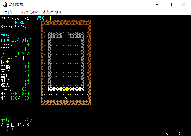 クエストに挑む前に現状の確認をします。現在の信仰度は2です。信仰度を3に上げるには鉄獄地下20階あたりでユニーク狩りをすれば良いのかな。最近はクエストばかりで鉄獄の探索に戻りたくなってきた。