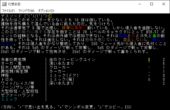 デスソードの部屋に到達したので調査してみました。HPは低いけど速度が20もあります。この調査結果を見て僕ちゃんは楽勝だと敵を舐めてしまった。ここで2~3発くらいボール系の魔法棒をぶち込んでおけば良かった。