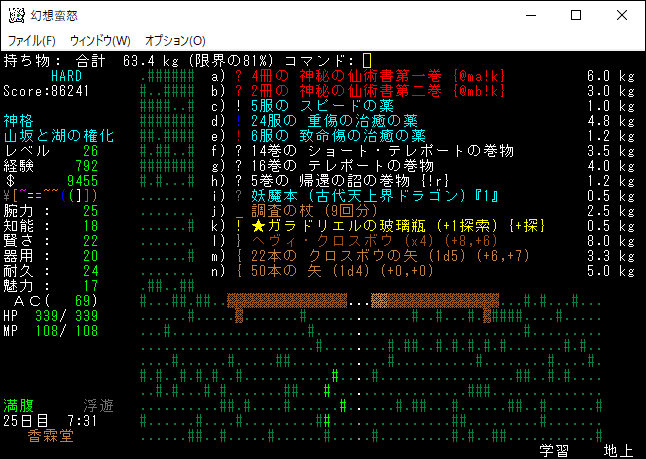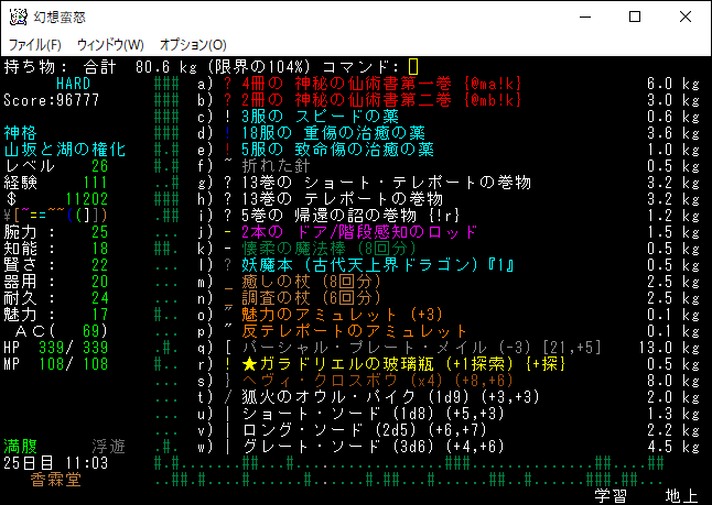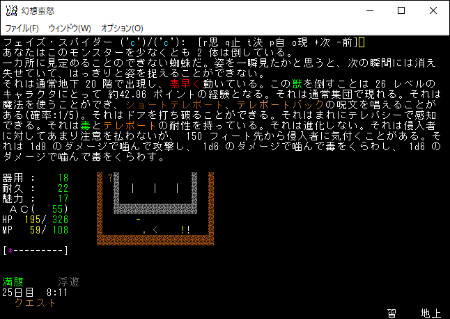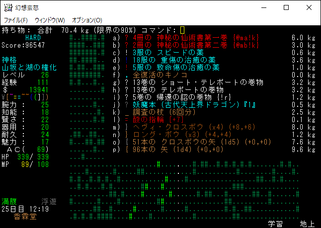 やべーよ。テレポートバックとデスソードの攻撃をくらいまくって瀕死になってしまった。テレポートの巻物で逃げようとしたけど、フロアが狭いため、結局はデスソードの部屋に戻ってしまう。これは次のターンに死んでもおかしくないね。うーむ、まずはスピードの薬を飲んでフェイズのテレポートバッグを1ターン耐え忍ぶ。そしたら回復する。あとは近くにいるデスソードにクロスボウを撃ちまくって敵の数を減らしていくしかない(ボール系の魔法棒を使うのがベストだった)。
