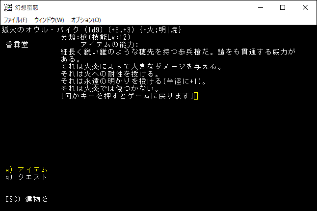 地上に帰還した時の所持品は上の画像。残念ながら★リンギルを拾うことはできなかったよ。反テレポートのアミュレットはこのクエストで確実に入手できる装備品ですね。折れた針は霧雨魔法店でポイントに変換できたはずだ。あとのアイテムは売却品かなあ。狐火のエゴ武器は初ゲットしたので*鑑定*します。