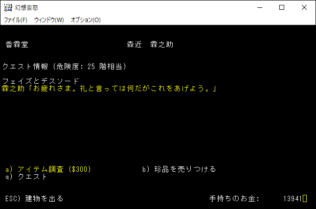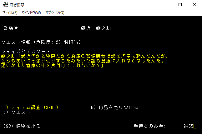 以上でクエスト前の準備は終わり。フェイズとデスソードのクエストは香霖堂で引き受けることができます。前回のミミッククエストと同じく森近霖之助から受領するのだ。