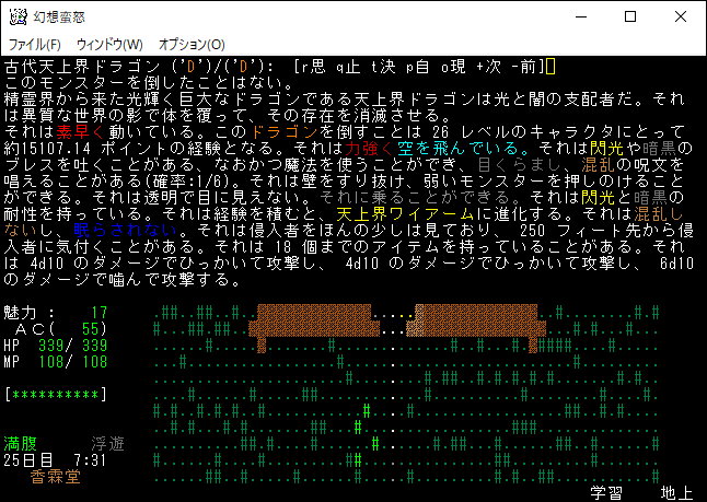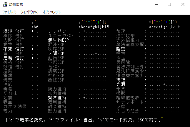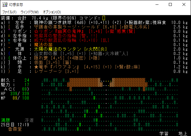現在の耐性は上の画像。この耐性なら地下20階でユニーク狩りを出来るだろうか。カオスの耐性がないからガチャピンのブレスで即死しそうだ。