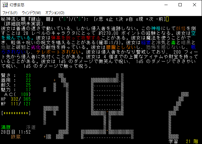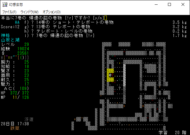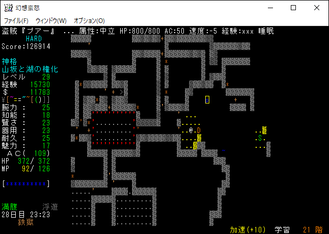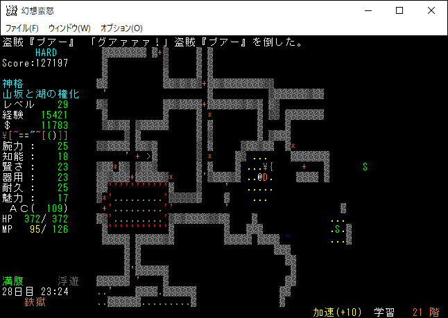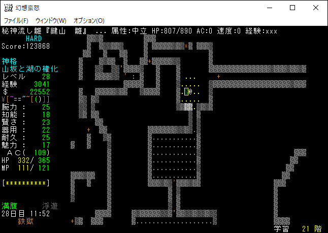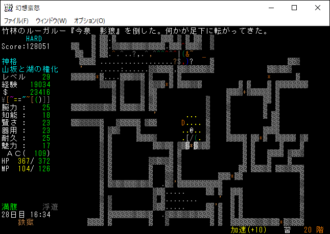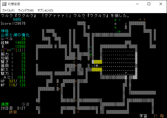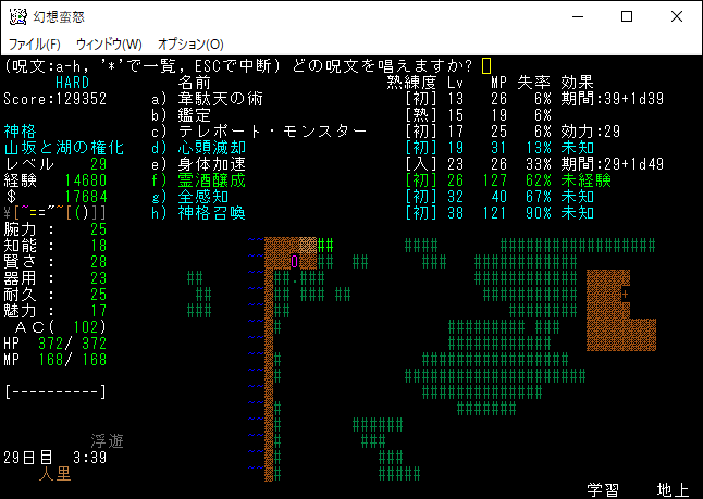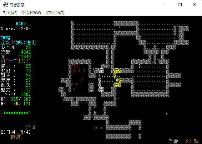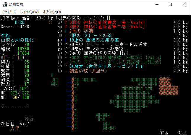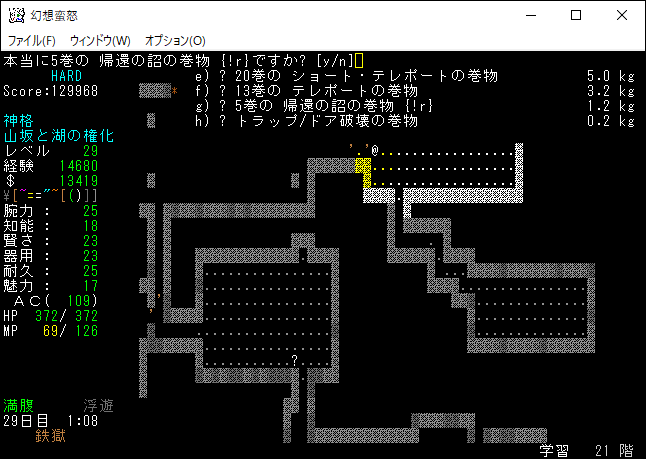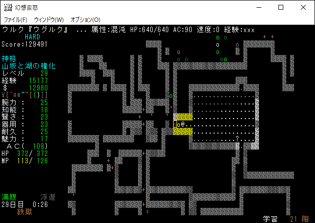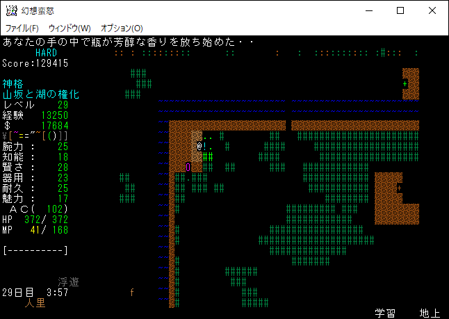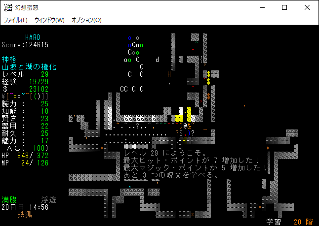 現在探索中の小部屋は罠、アイテム、敵だらけで探索するのが大変だ。必死こいて敵をしばいていたらレベルが29になりました。あとMPが1上がっていれば霊酒醸成を唱えられたのに残念です。