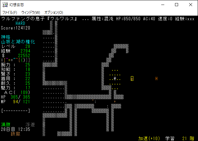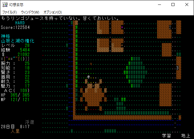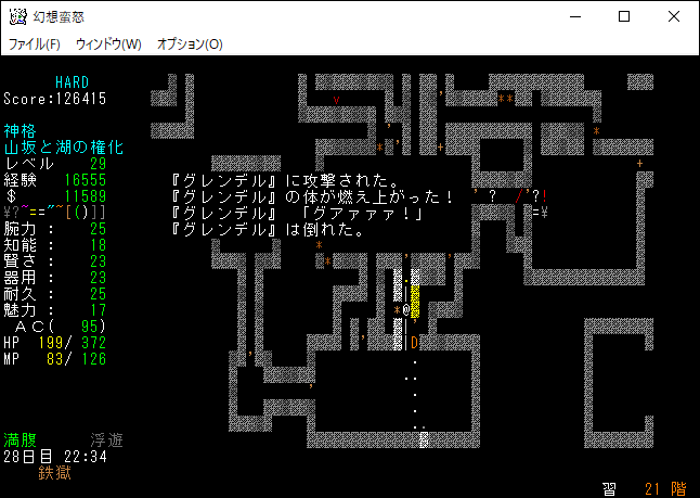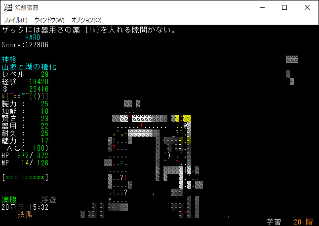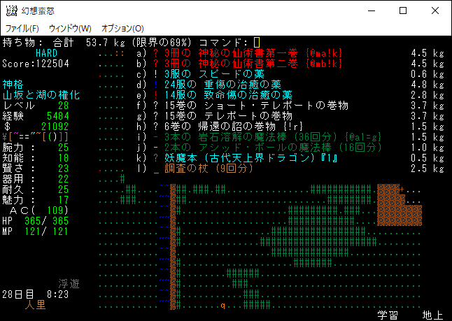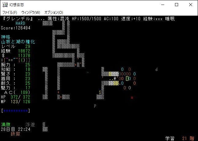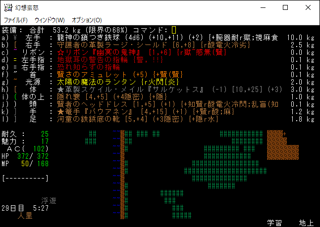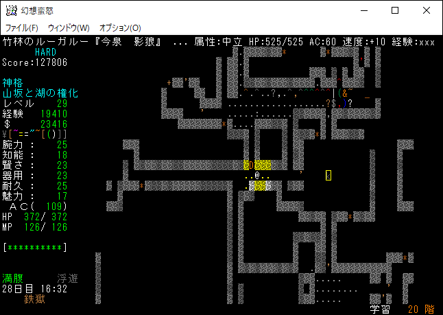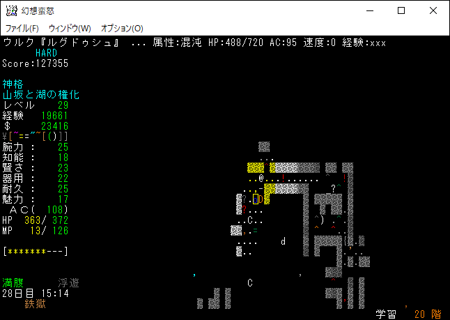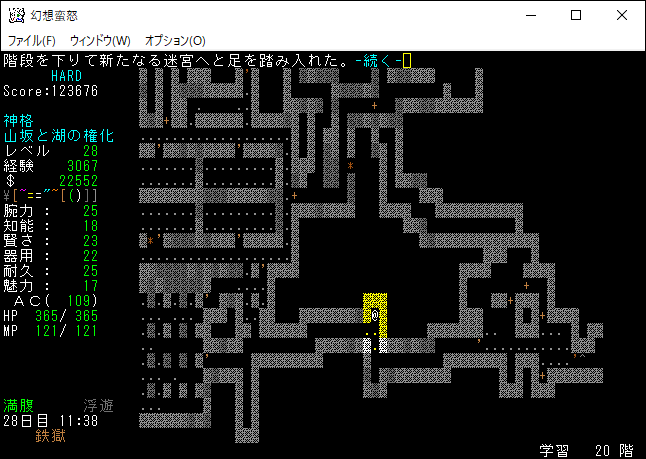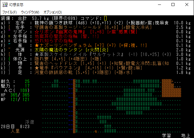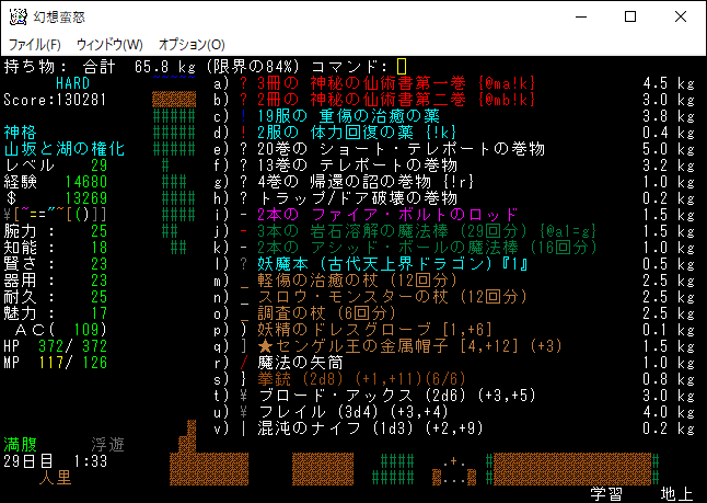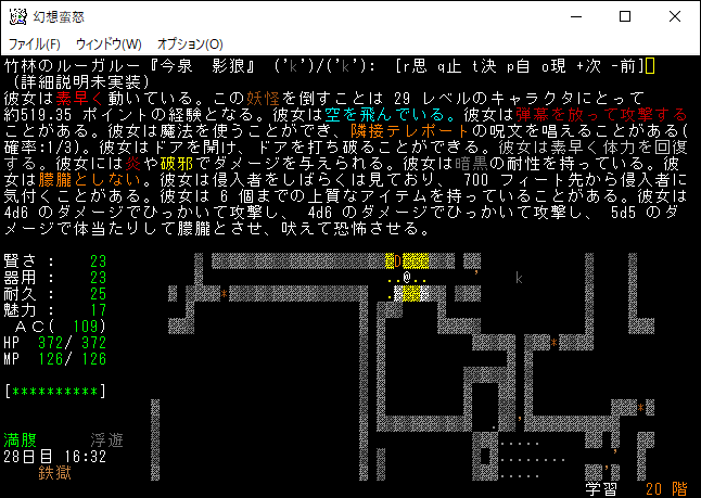 現在探索中の小部屋は罠、アイテム、敵だらけで探索するのが大変だ。必死こいて敵をしばいていたらレベルが29になりました。あとMPが1上がっていれば霊酒醸成を唱えられたのに残念です。