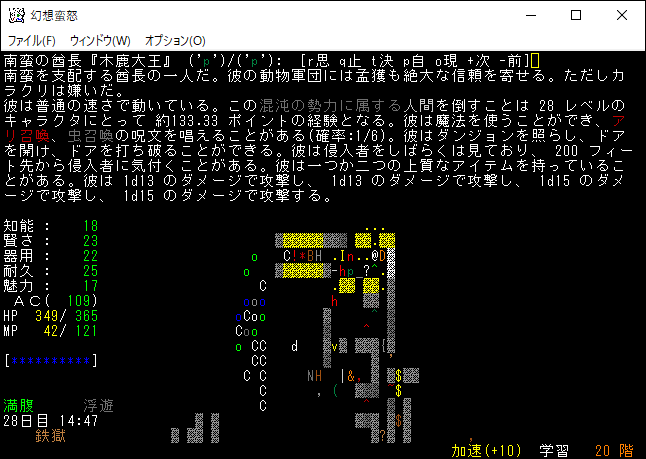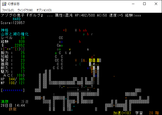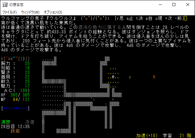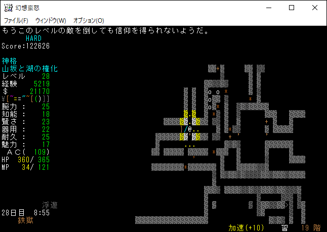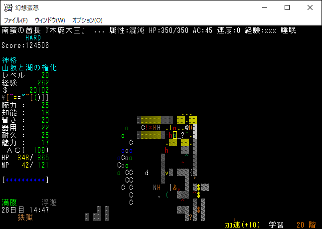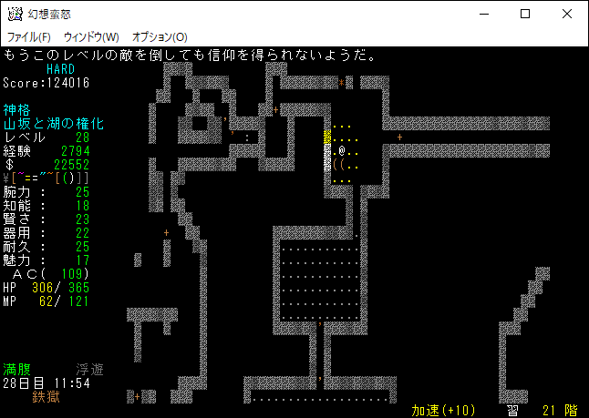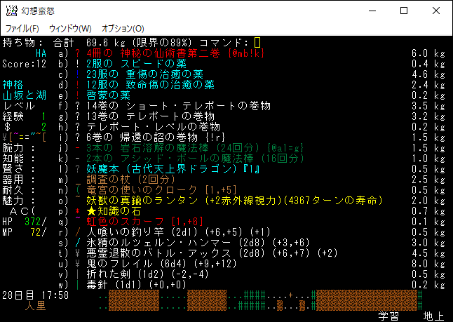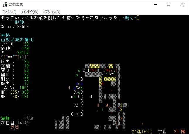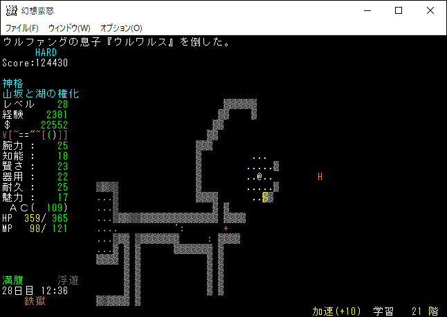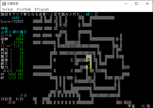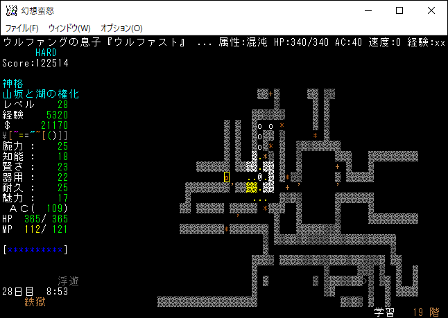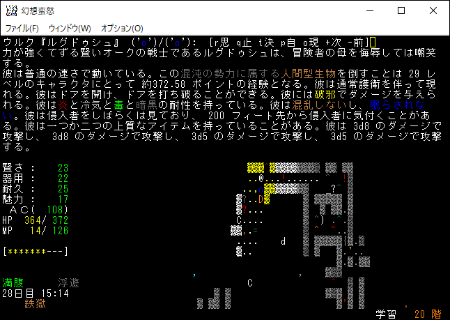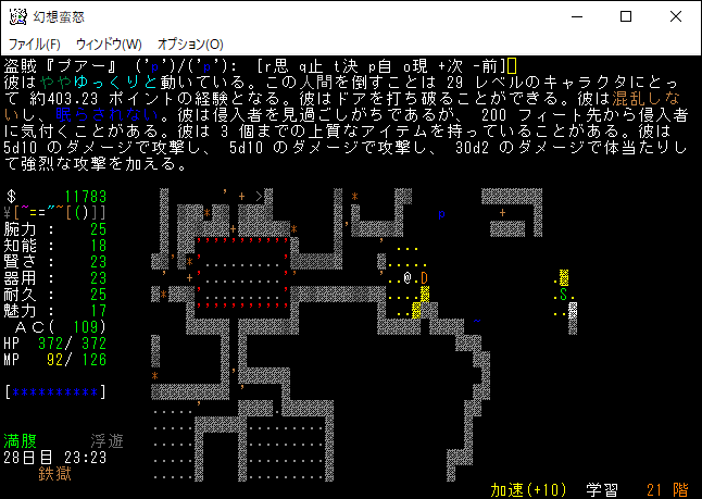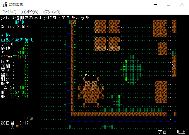 現在探索中の小部屋は罠、アイテム、敵だらけで探索するのが大変だ。必死こいて敵をしばいていたらレベルが29になりました。あとMPが1上がっていれば霊酒醸成を唱えられたのに残念です。