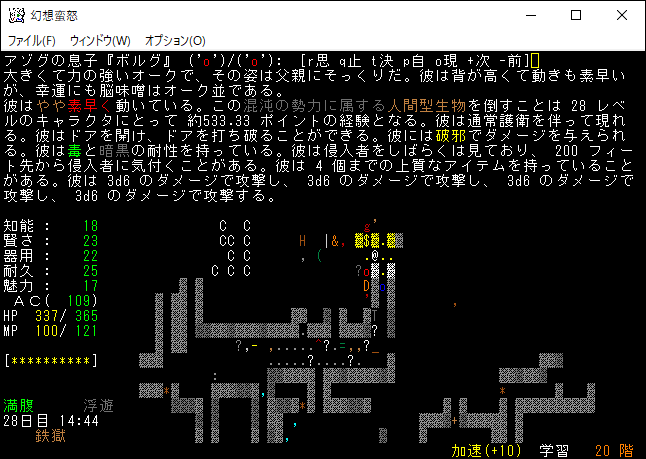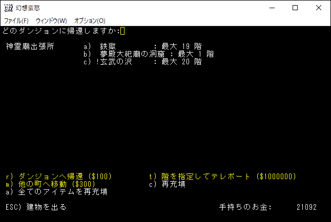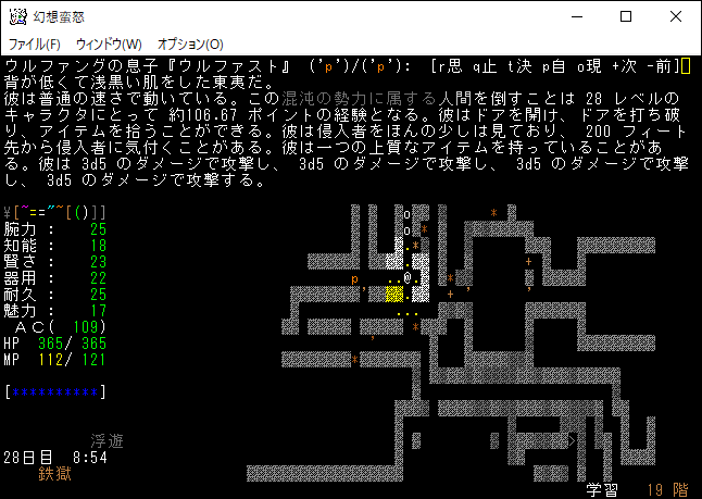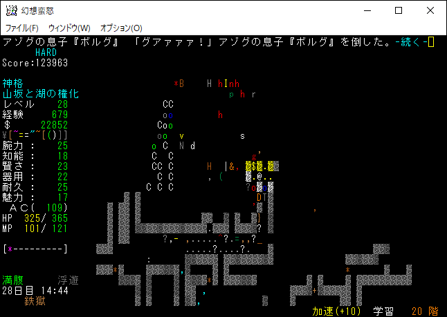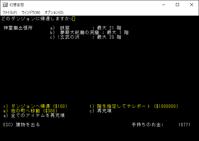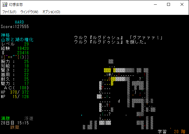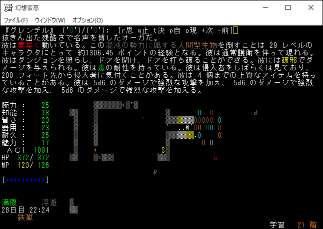 ウグルクを倒したら階層の雰囲気が普通になりました。まだザックの中身に余裕はあるけど、疲れたので人里に帰還します。今回は多くのユニークモンスターを倒すことができた。だけど全モンスター感知が無かったら何倍も苦労をしていただろう。八坂加奈子をプレイキャラクターにするのはお勧めできない。たいして強くないのにフロア中を歩き回ってユニークモンスターを探すのは苦行すぎる。