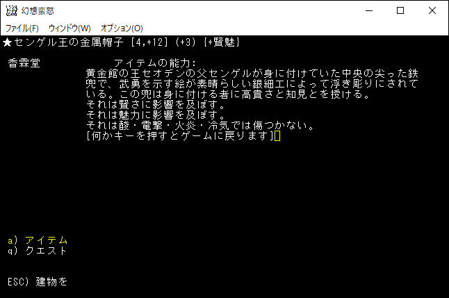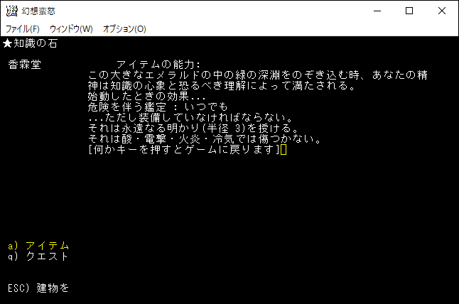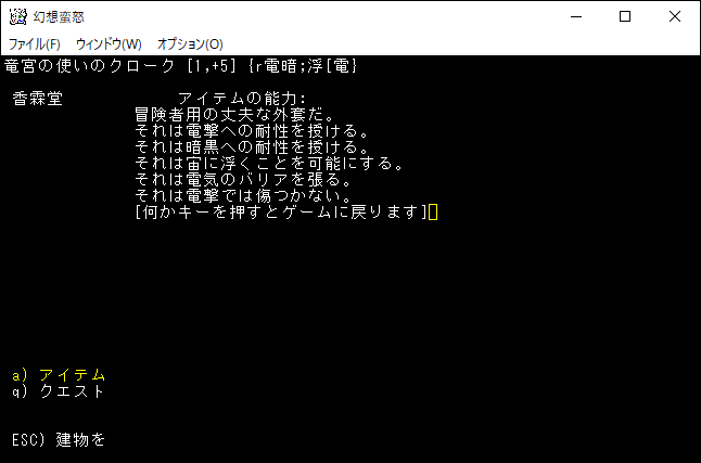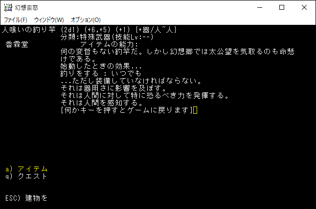 人喰いの釣り竿の*鑑定*結果は上の画像。釣りのシステムは本家変愚蛮怒にもあります。かなり古いバージョンでも釣りをすることが可能だった。しかし、俺は釣りをしたことがないため釣り竿について語ることができません。