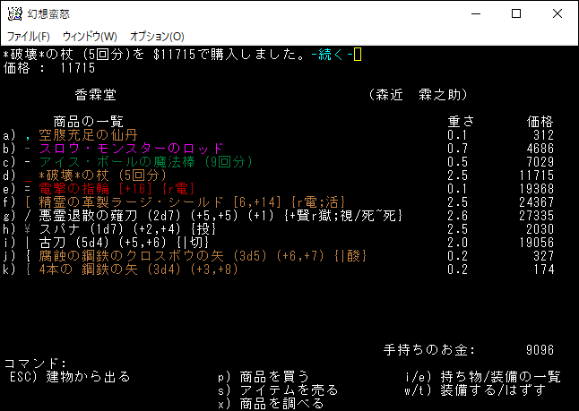 結局、即戦力になるような武具を拾うことはできなかった。ブラマを覗いたところ*破壊*の杖が販売されているのに気づく。迷うことなく購入しておいたよ。*破壊*の杖は霧雨魔法店で入手する予定だった。地下24階ランダムクエストに必須の魔道具です。