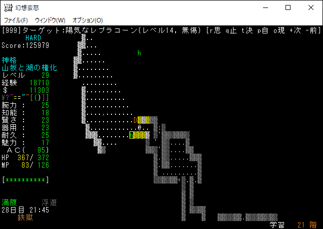 地下21階に降りて全モンスター感知を使ったら2体のユニークがいやがった。そのうちの1体が秘神流し雛「鍵山雛」だ。鍵山雛の攻撃をくらうと装備品が呪われてしまうのかな。よくわからないけど距離を取って戦います。
