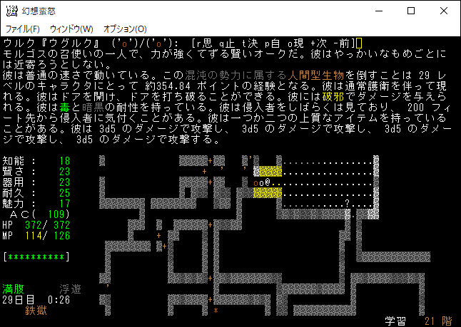 今度はモルゴスの召使いである、ウルク「ウグルク」と戦います。速度が普通だし魔法を唱えてこない脳筋ユニークだ。まあ配下のドラゴンがいなくても余裕で勝てる相手だな。