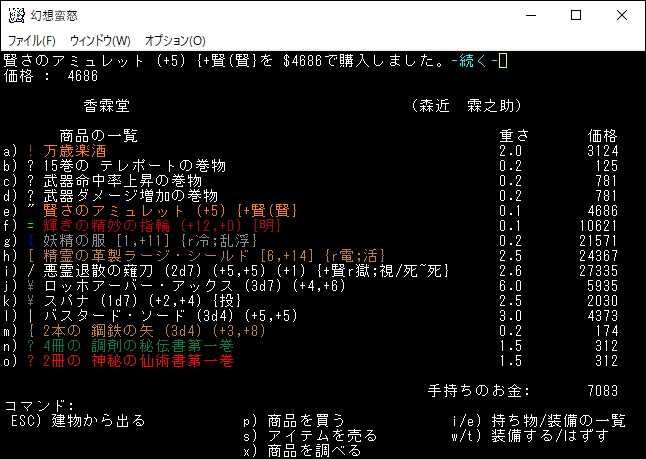 アミュレットのおかげでMPが上昇しました。ようやく霊酒醸成を唱えることができるようになった。失敗率が高いからダンジョンで唱えるのは危険だろう。人里で何個か霊酒を作っておきます。