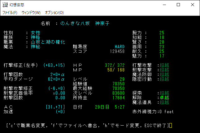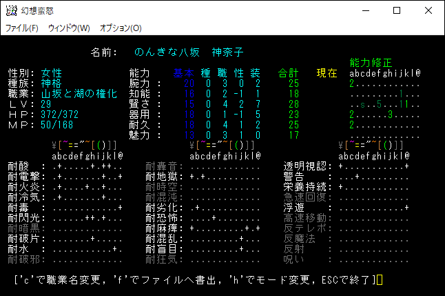 現在の能力値は上の画像。なんというか器用貧乏な能力に思える。突出した性能は無いし、取り柄と言える技能もありません。まあ正直に言ってしまうと地味なキャラクターだ。八坂さん。あんた地味なんだよ。