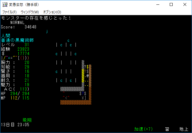 『c』がフェイズ、武器に見える『l』がデスソードですね。フェイズもデスソードも対策をしていれば脅威ではない。まず何とかしたいのは『j』のゼラチン・キューブです。こいつはタフなうえに酸の攻撃をしてくる。育てたペットに任せれば楽だけどアイテムを落とすから自力で倒したい。