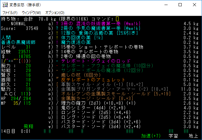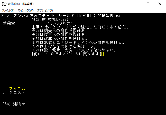 クエストから持ち帰ったアイテムは上の図。フェイズのクエストでは確実に反テレポートのアミュレットを取得できます。本家の狂戦士みたいにテレポート無しの職業だと必須になるのかな。記憶が薄れているから上手い使い方は忘れました。オルレアンのエゴ盾がありますね。鑑定をしようか。