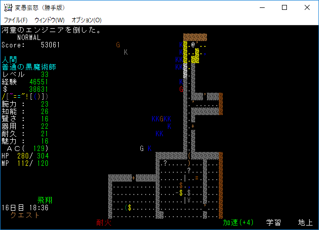 注意モンスターと書かれていた河童のエンジニアをサクッと倒した。魔理沙が強いから適当プレイをしても勝ててしまうね。本家よりもアイテムを落とす敵が多いな。どのモンスターがファイア・ボルトを唱えるわけ?