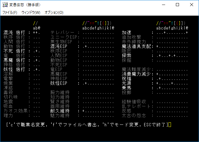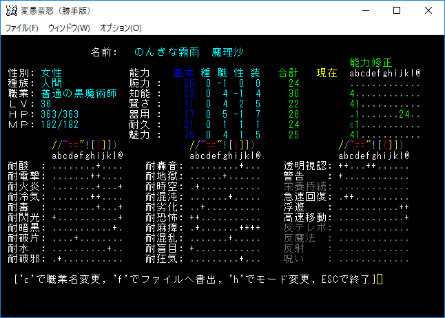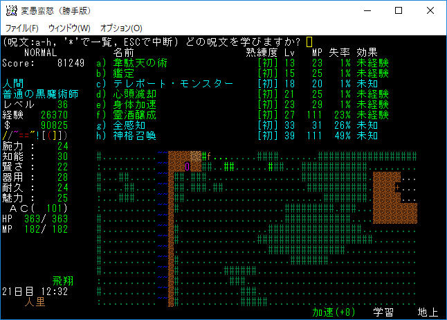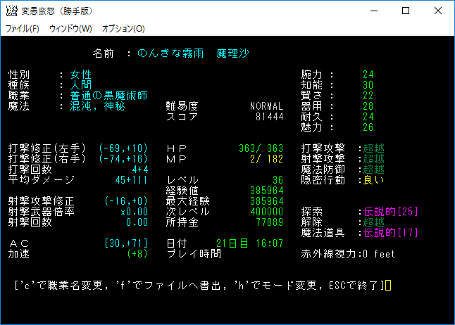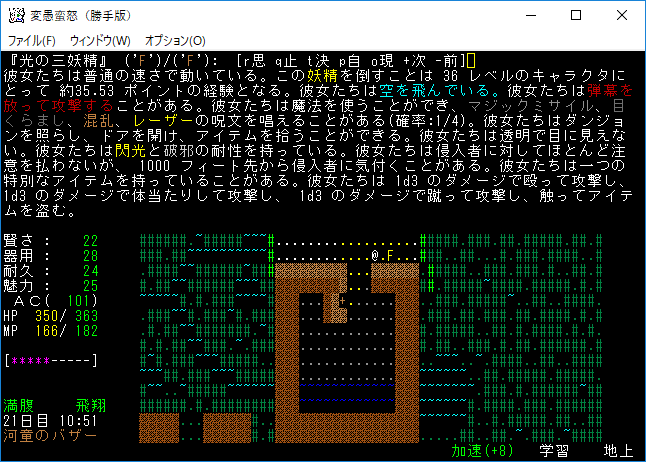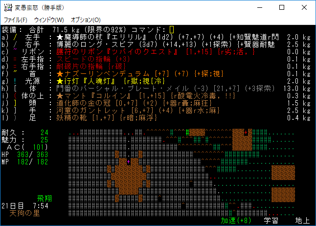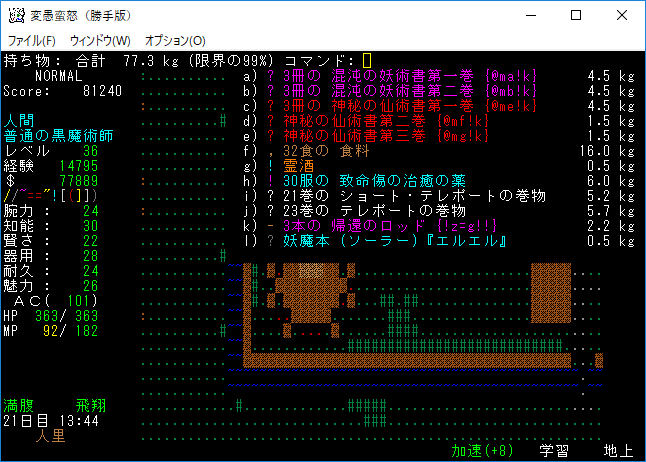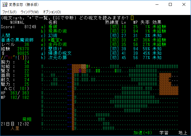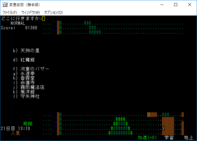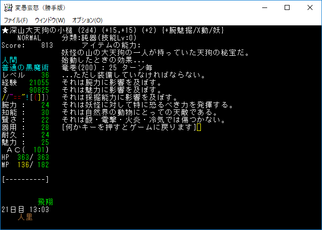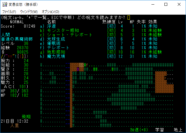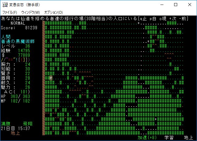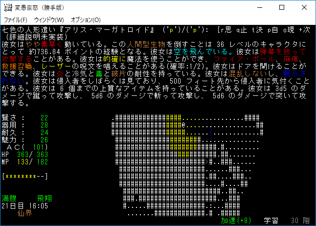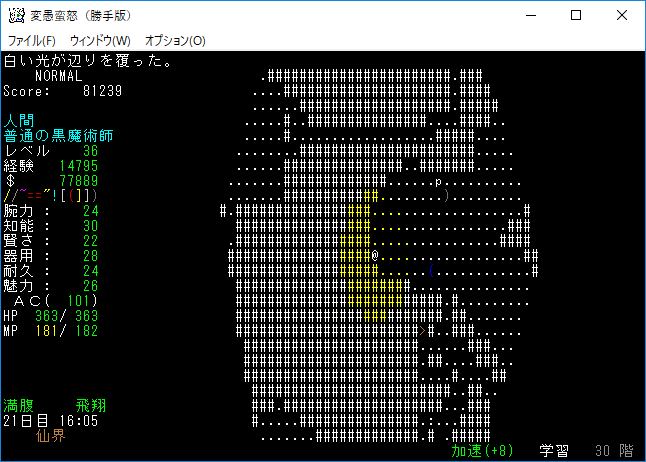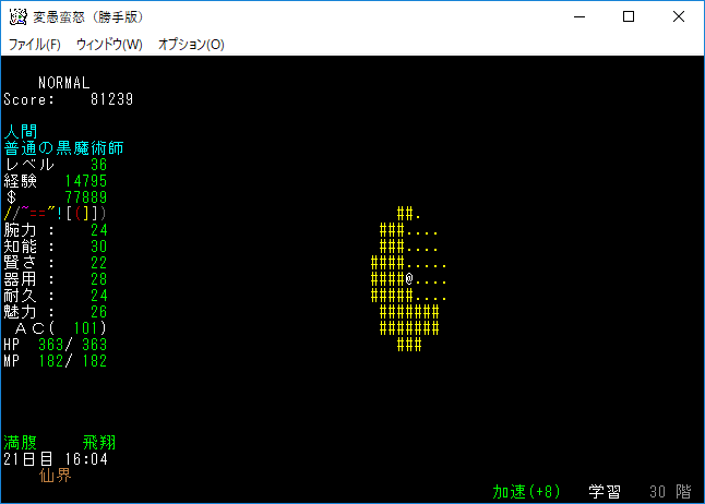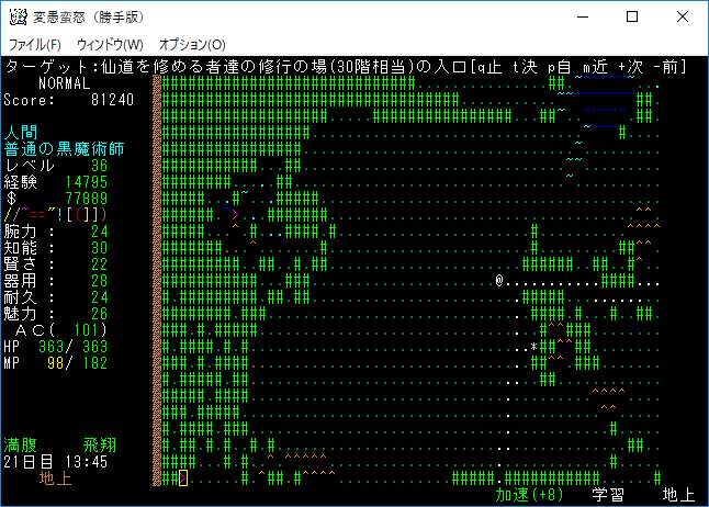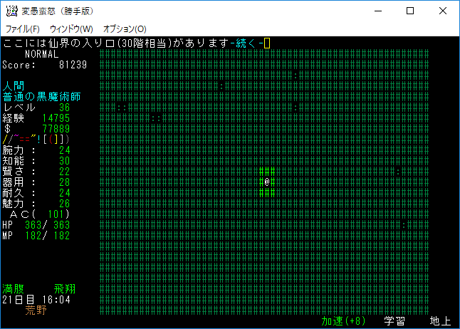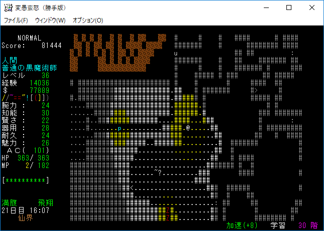 おはようございます。変愚蛮怒東方Project勝手版のプレイ日記を始めます。今回からダンジョン『仙界』の攻略に取りかかります。『仙界』は武器での攻撃が出来なくなるダンジョンです。