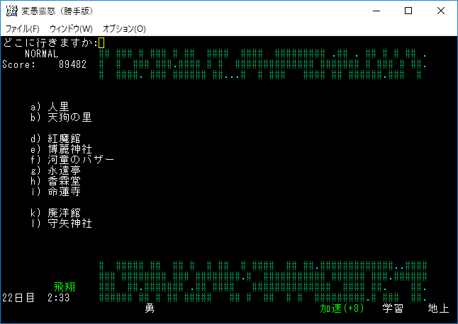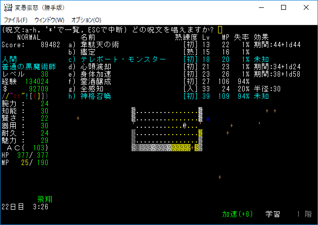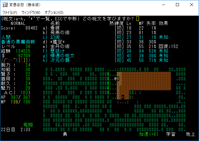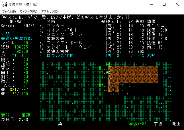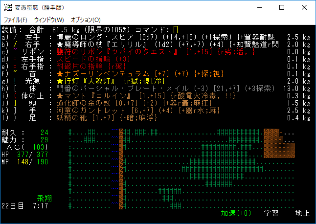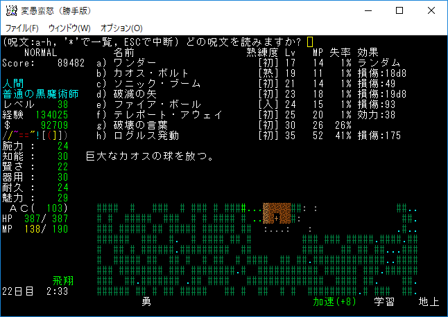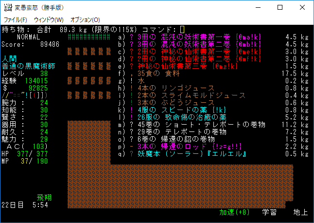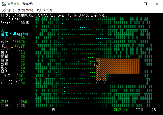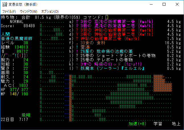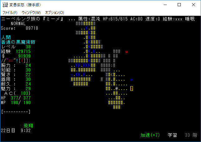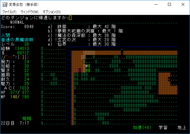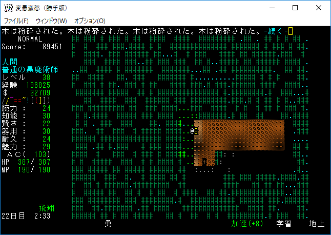おはようございます。変愚蛮怒東方Project勝手版のプレイ日記を始めます。中断をしていた『仙界』の探索を再開します。そろそろ反射の耐性が欲しいなあ。
