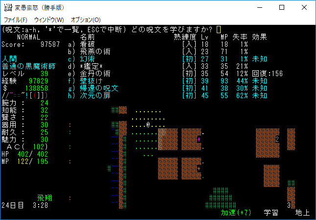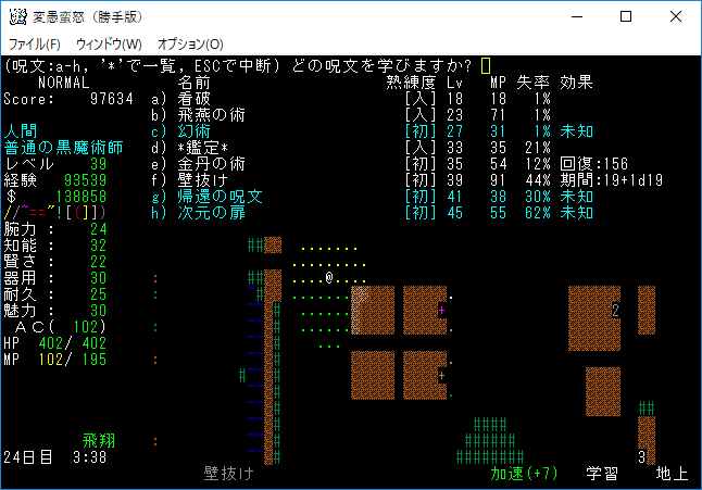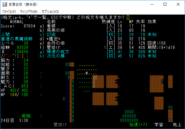 壁抜けの魔法は消費MP91、失敗率は44%です。こういっては何だけど今のままでは使い物にならないと思う。変愚蛮怒は覚えた呪文をさらに学習することで熟練度を上げられます。