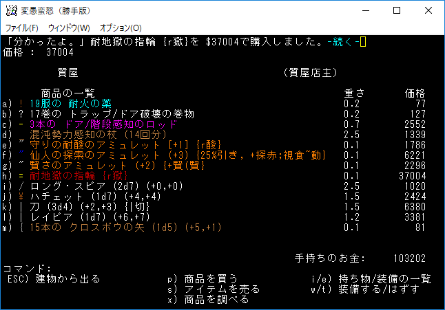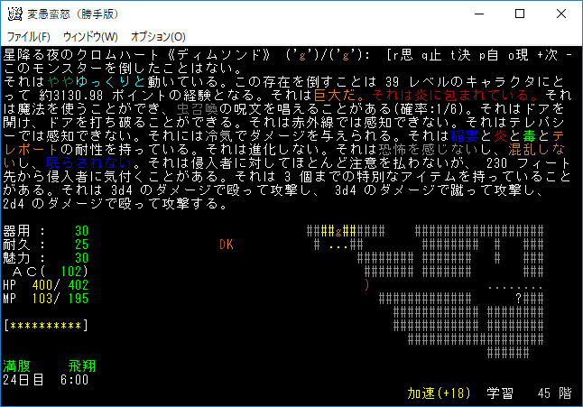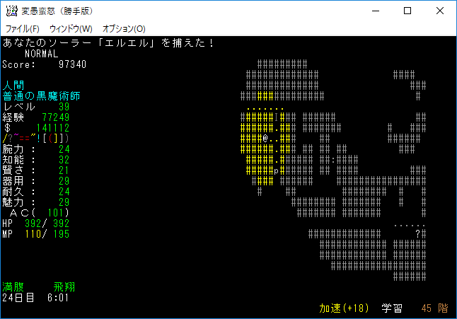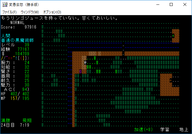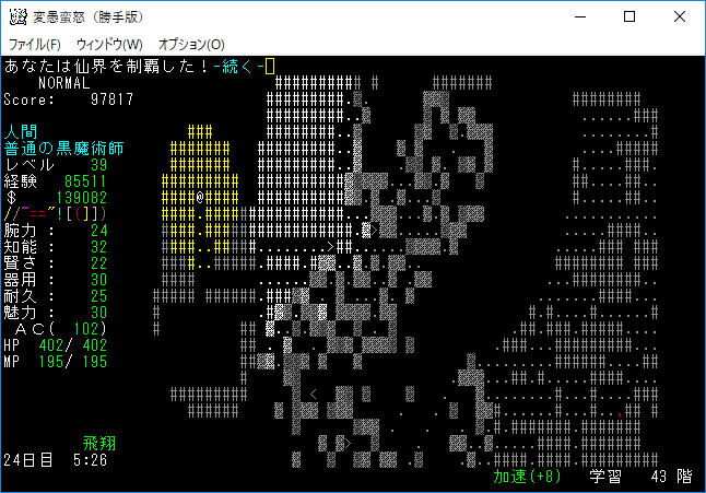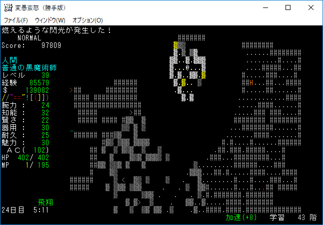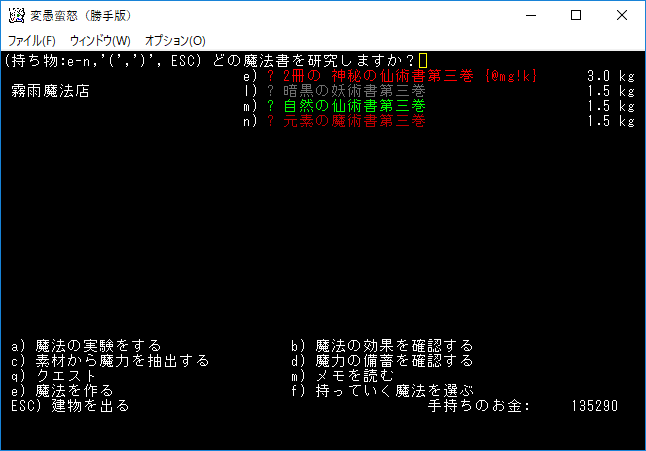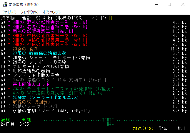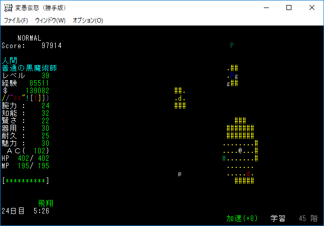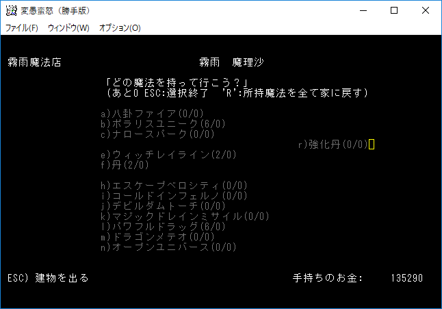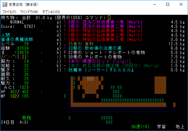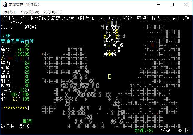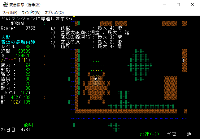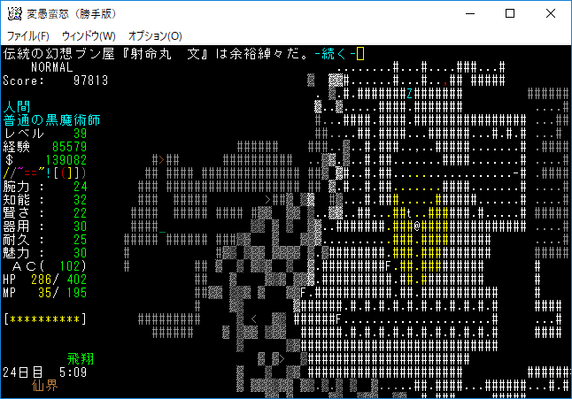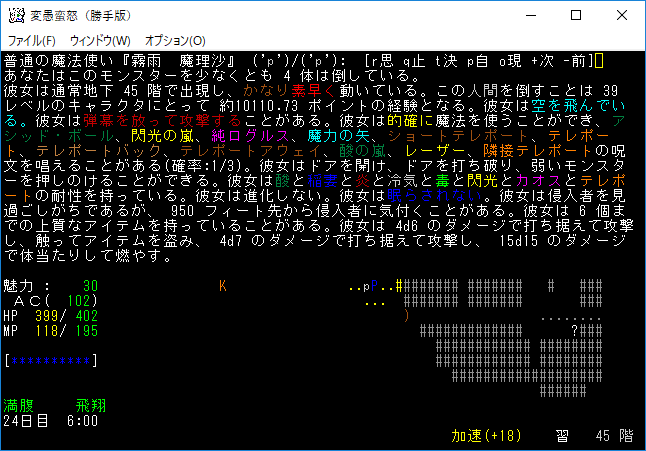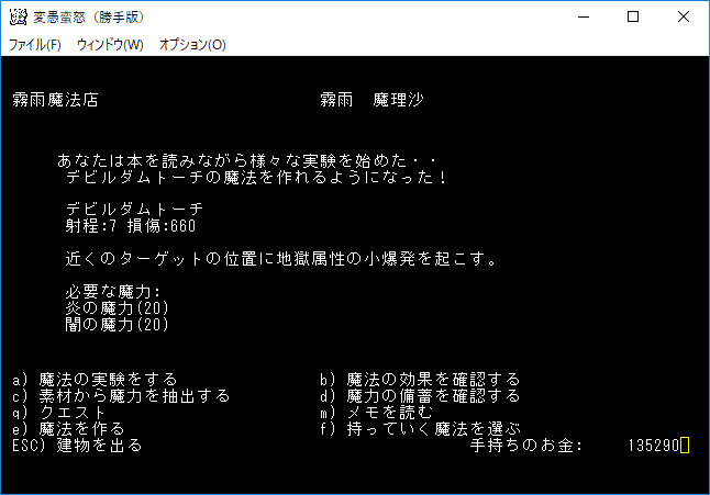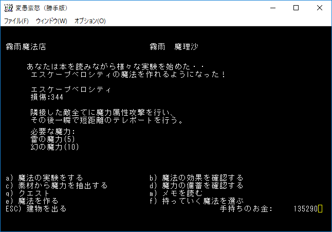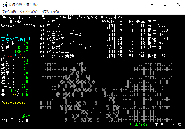 おはようございます。変愚蛮怒東方Project勝手版のプレイ日記を始めます。前回は下手くそなプレイをして魔理沙が倒されそうになりました。しかしながらダンジョン『仙界』の制覇は目前。*破壊*を唱えて踏破します。その前に魔法の学習と自作魔法の研究をしよう。