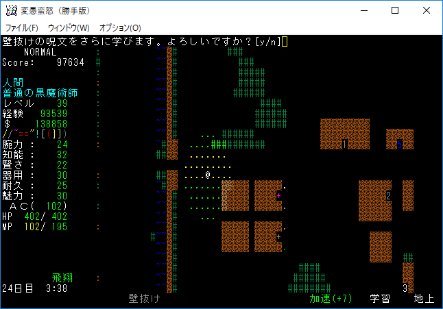 レベルが39になりました。神秘の領域3冊目に記されている『壁抜け』の呪文を学習します。これは本家変愚蛮怒の匠の領域に記載されている強力な魔法です。(他の領域でも学習できたっけ?)。