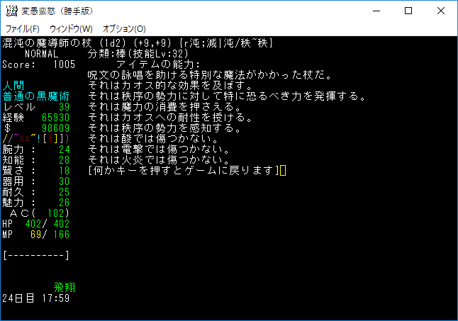 混沌の魔導師の杖が作成されました。カオス効果、カオス耐性、秩序スレイ、秩序ESPのある杖をゲットです。追加耐性は付かなかったと思う。凡庸化にて吟味できたら強力すぎるからね。混沌エゴは酸と電気で傷つかない能力もあるらしい。
