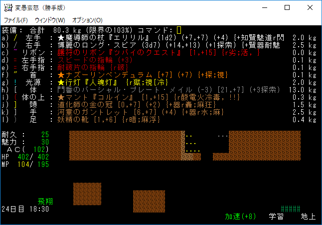 装備は『仙界』に突入した時と同じです。パズルを頑張れば隠密やACを増やせそうだけどね。ぶっちゃけ時間が無かった。
