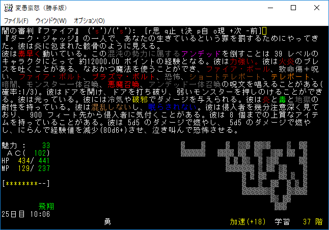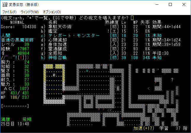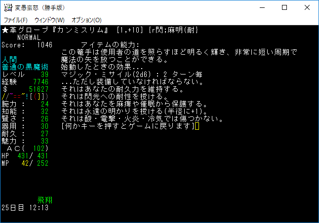 紅魔館深部36階へ帰還をします。そろそろユニークの強さが凶悪になってくる。雑魚敵も魔力の矢や召喚魔法を使ってくるから恐ろしいよ。