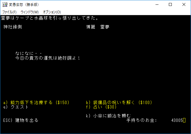 また霊夢に占いをしてもらおう。このシステムは本家に無かったし楽しいと思う。占いの結果は『絶好調』。アーティファクトを沢山拾えたりするのかな。