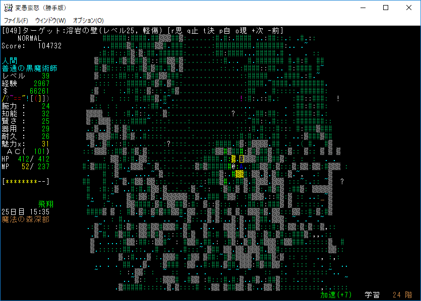 帰還のロッドを使って魔法の森深部36階と人里を往復する。残念ながら花崗岩の壁と出会うことはできなかった。諦めて魔法の森深部の入口(地下24階)の階段にてスカムをすることにします。