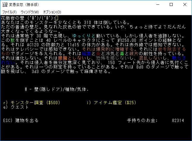 本家変愚蛮怒にて花崗岩の壁を探す時は無生物ESPを利用していました(たぶん)。だが勝手版にそれらしきESPはない。種族を調べるためにモンスター調査の施設に向かいました。人里の稗田邸にてモンスター調査が可能なようです。