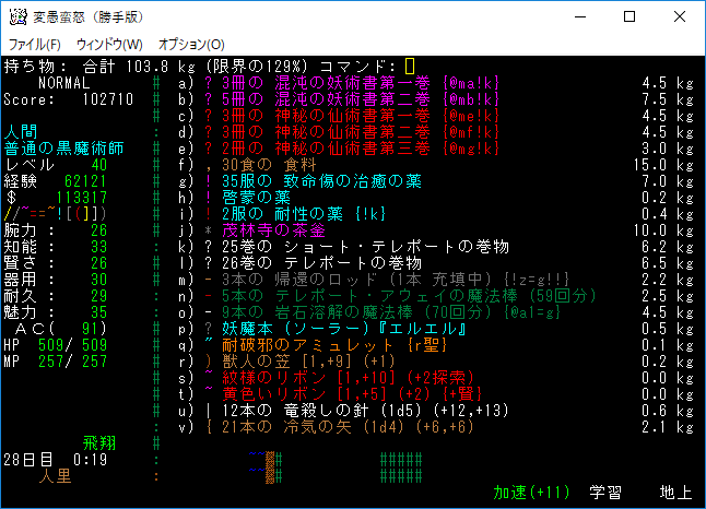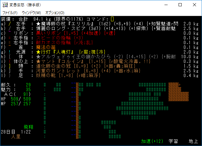 リボン枠を加速付きの黒いリボンに変えました。他にはカオスの指輪と破片・劣化耐性の鎧を装備したりね。残念ながらACは下がってしまった。