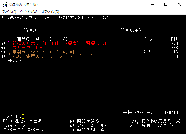 紋様のリボンが暗黒・狂気耐性と優秀な性能だった。気がつかなくて店に売ってしまったから買い戻しました(笑)。
