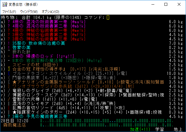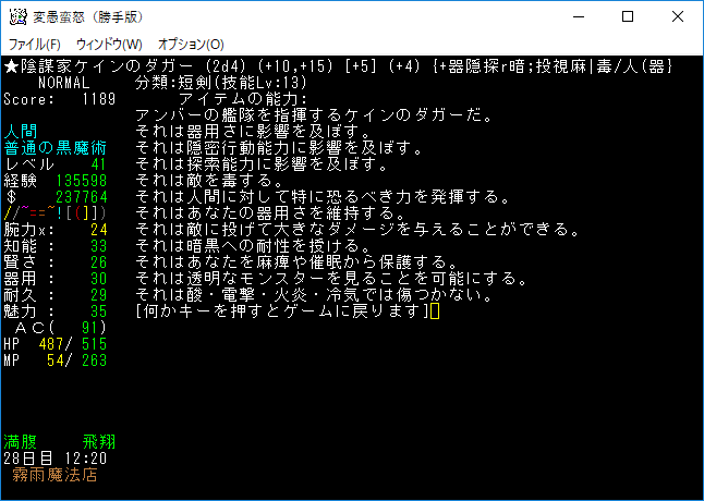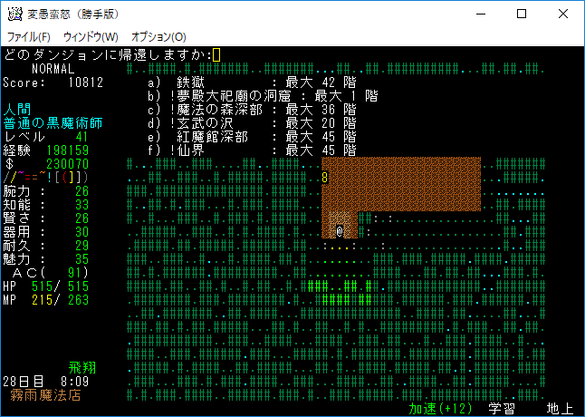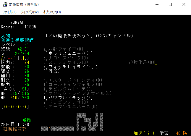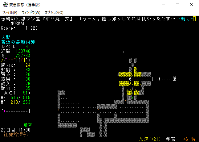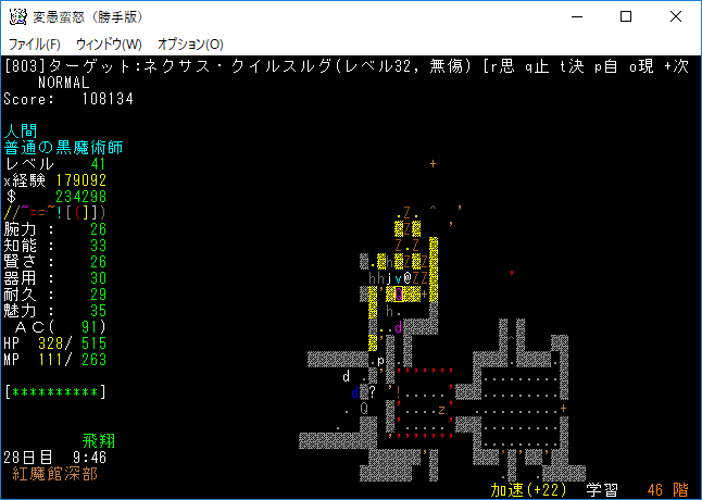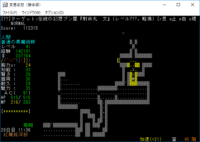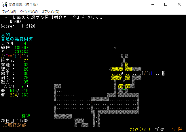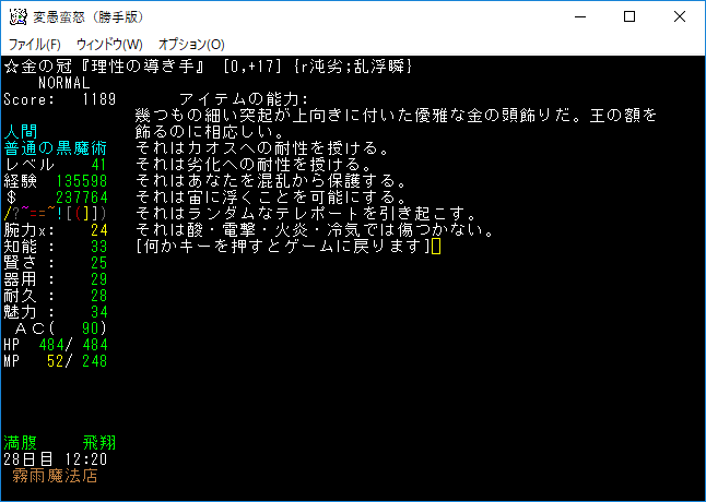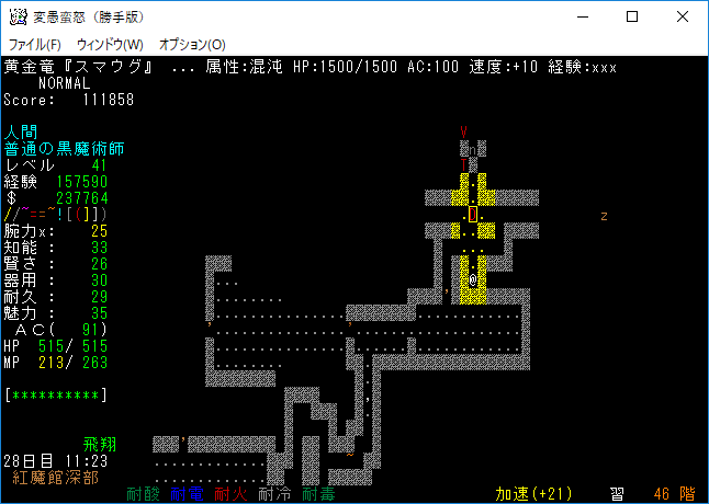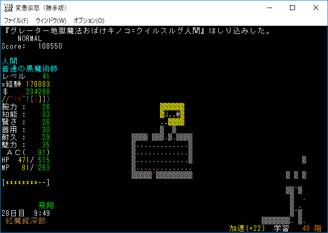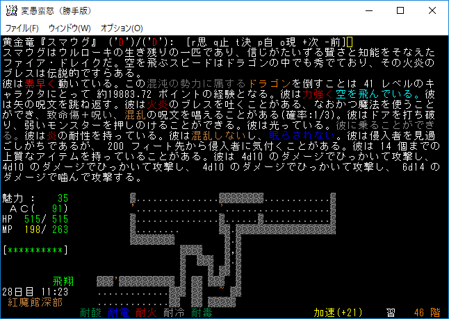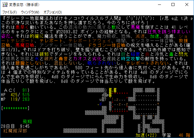 おはようございます。変愚蛮怒東方Project勝手版のプレイ日記を始めます。『紅魔館深部』を攻略中です。出会ったユニークは全員倒しております。靴枠や小手枠が貧弱なのでドロップに期待をしよう。