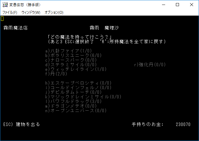 霧雨魔法店にて自作魔法を選択。ボラリスユニークを補充しておきます。そろそろ魔力が枯渇してきた。キノコ狩りをする必要があるかも。