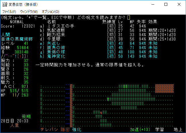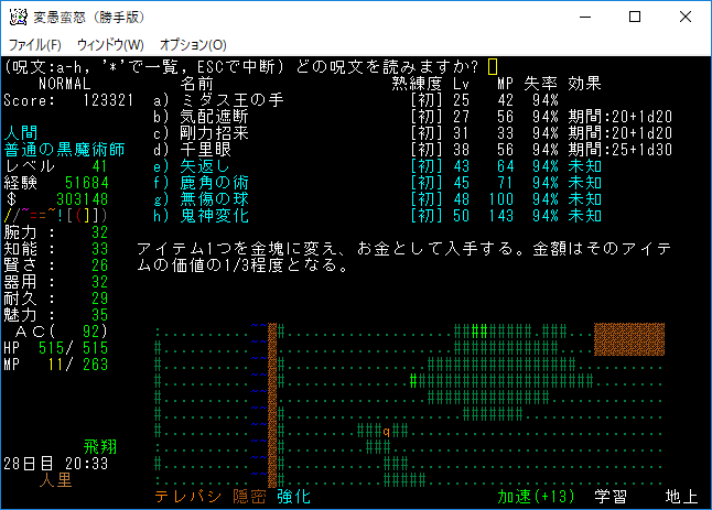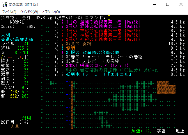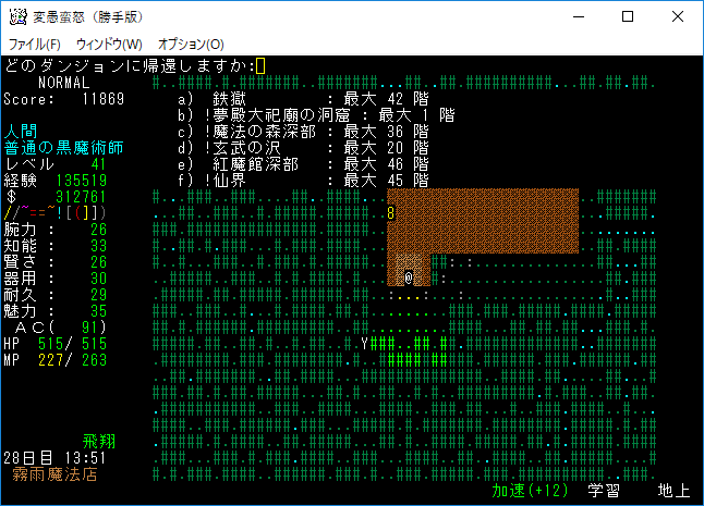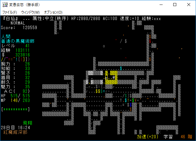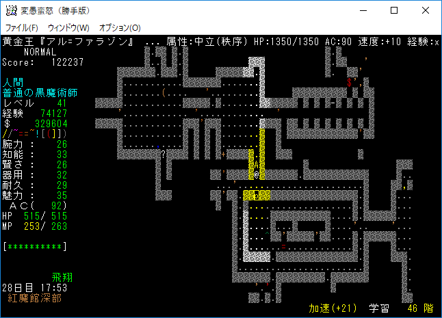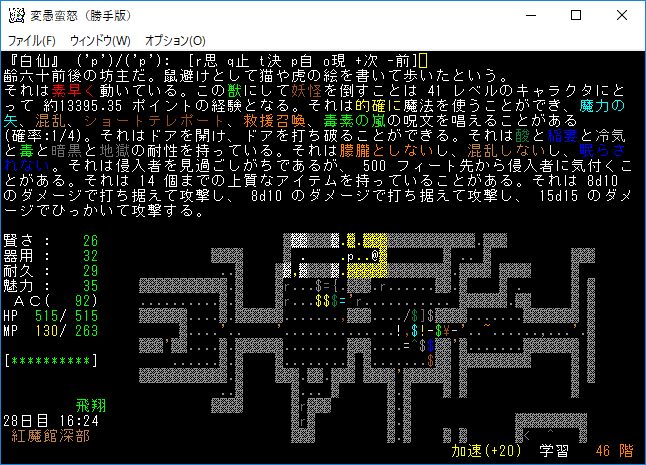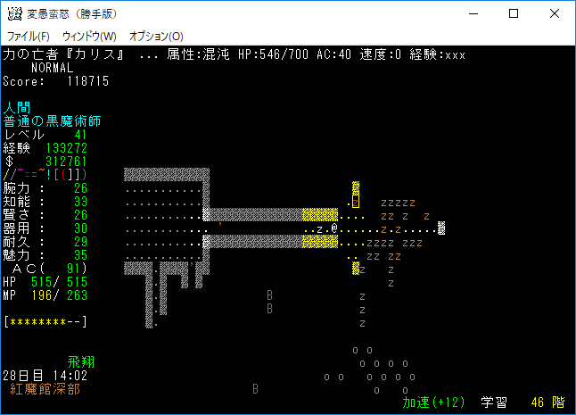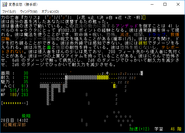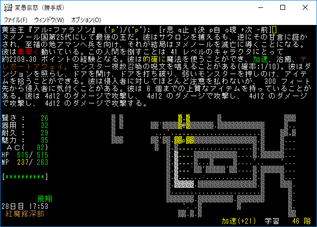 おはようございます。変愚蛮怒東方Project勝手版のプレイ日記を始めます。レミリアのいる『紅魔館深部』を攻略中。癖のあるユニークが出現するようになり戦闘が楽しいです。