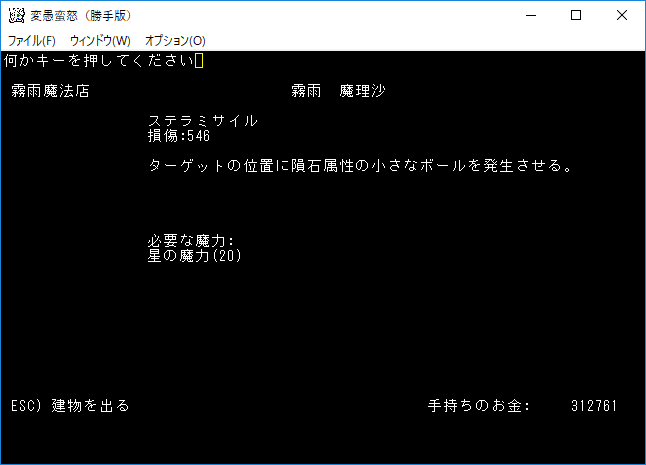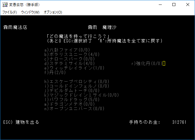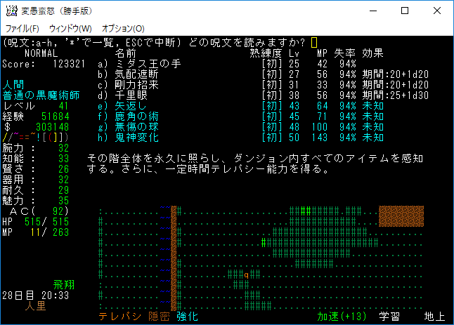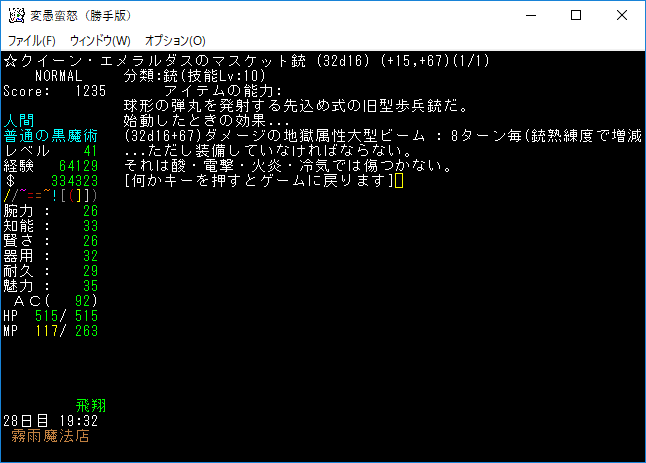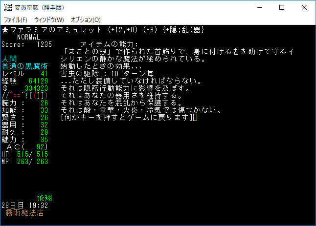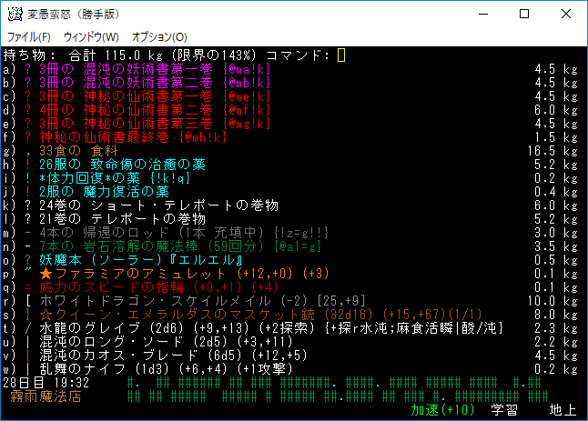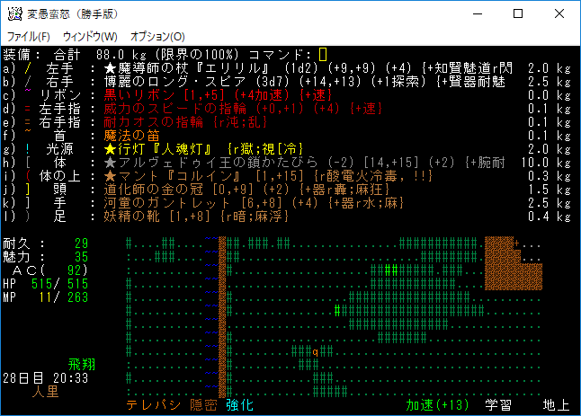 加速+4のスピードの指輪を手に入れました。あとは変わっていません。ダンジョンへ潜る度に魔理沙が強くなっていくよ。もうちょいユニーク狩りをしたいかも。